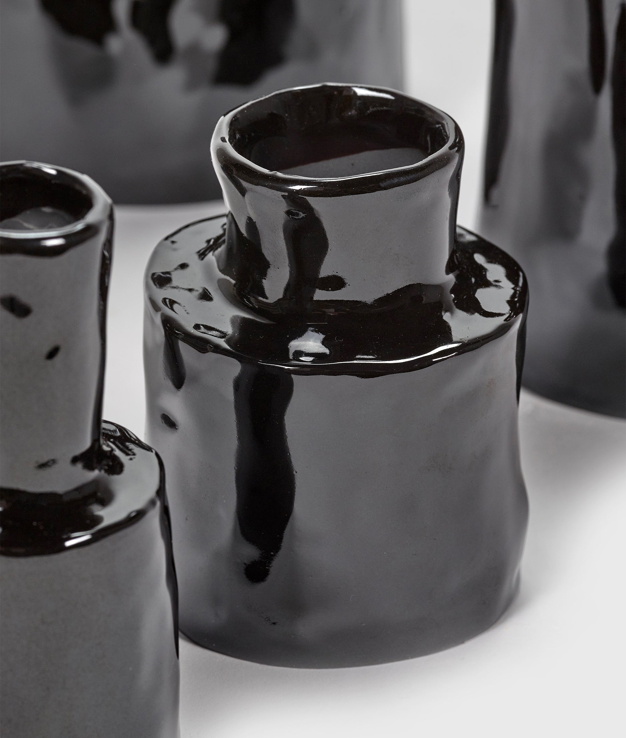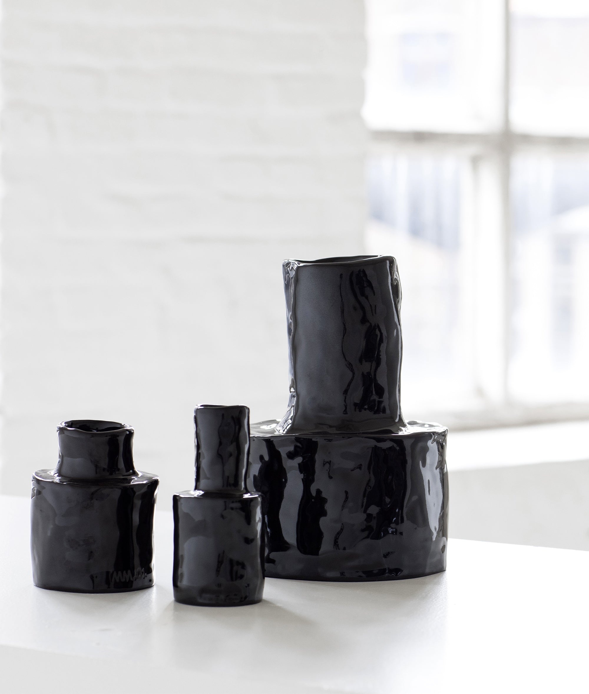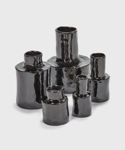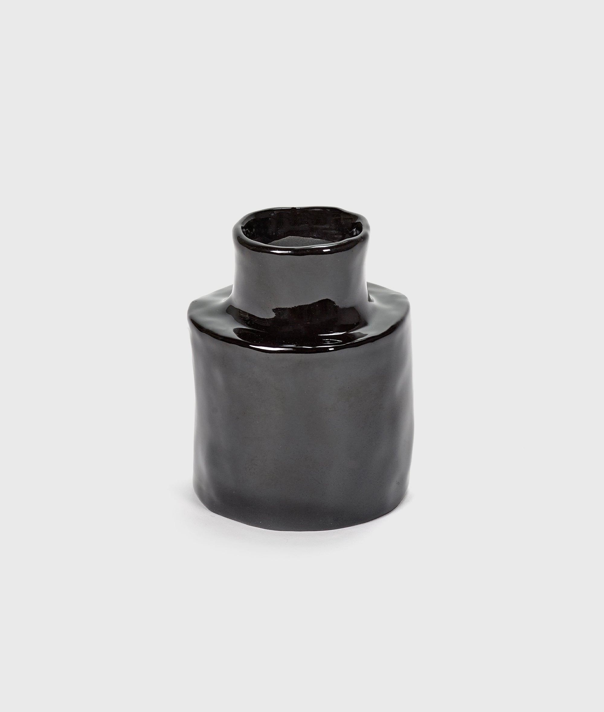 Small Serax vase, made of glazed stoneware. Designed by Marie Michielssen. The black Héléna vase stands out because of its simple cylinder shape. The handicraft is clearly visible in their unusual shapes. The vases are finished by hand, making each piece unique. Dimensions: L 7 W 7 H 9 CM.|