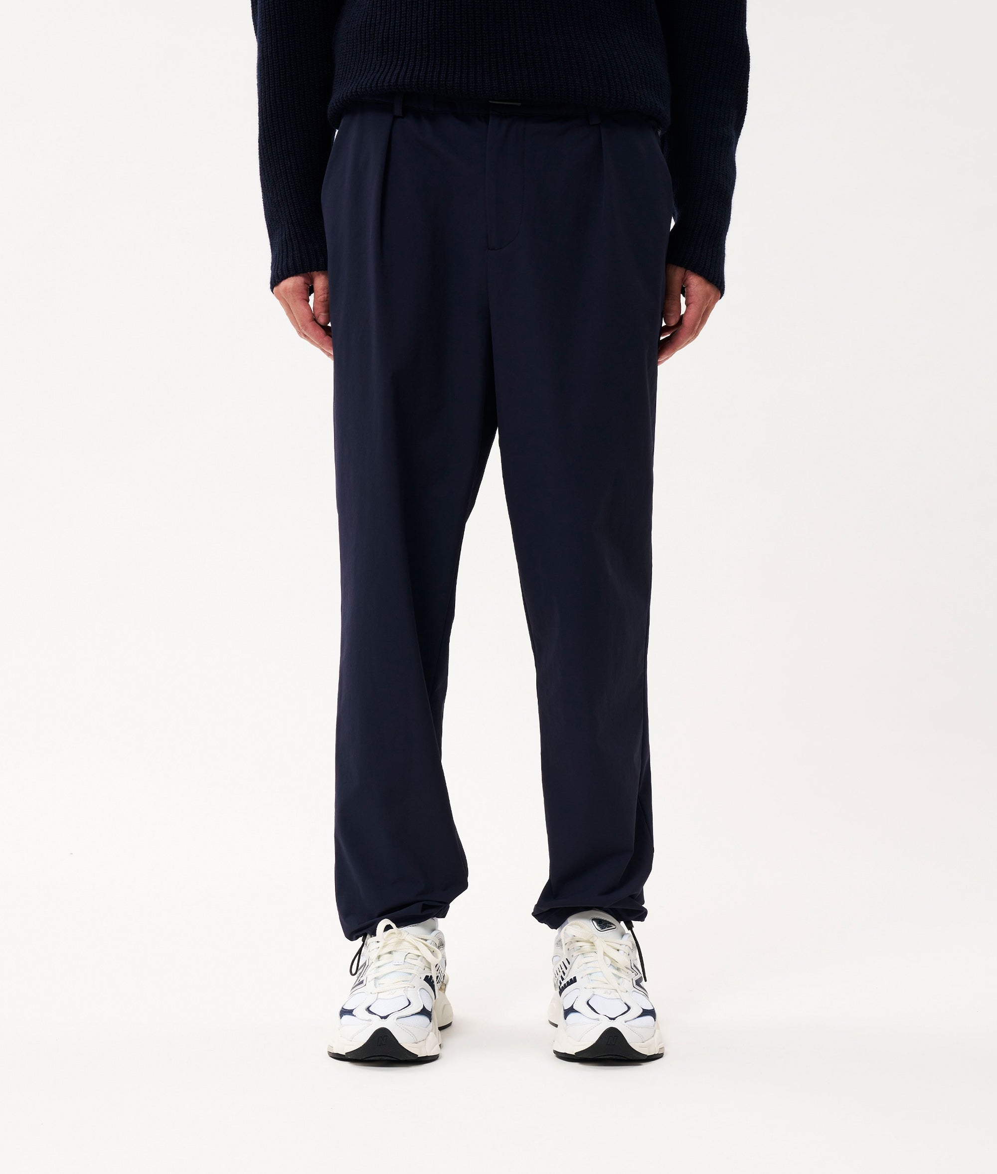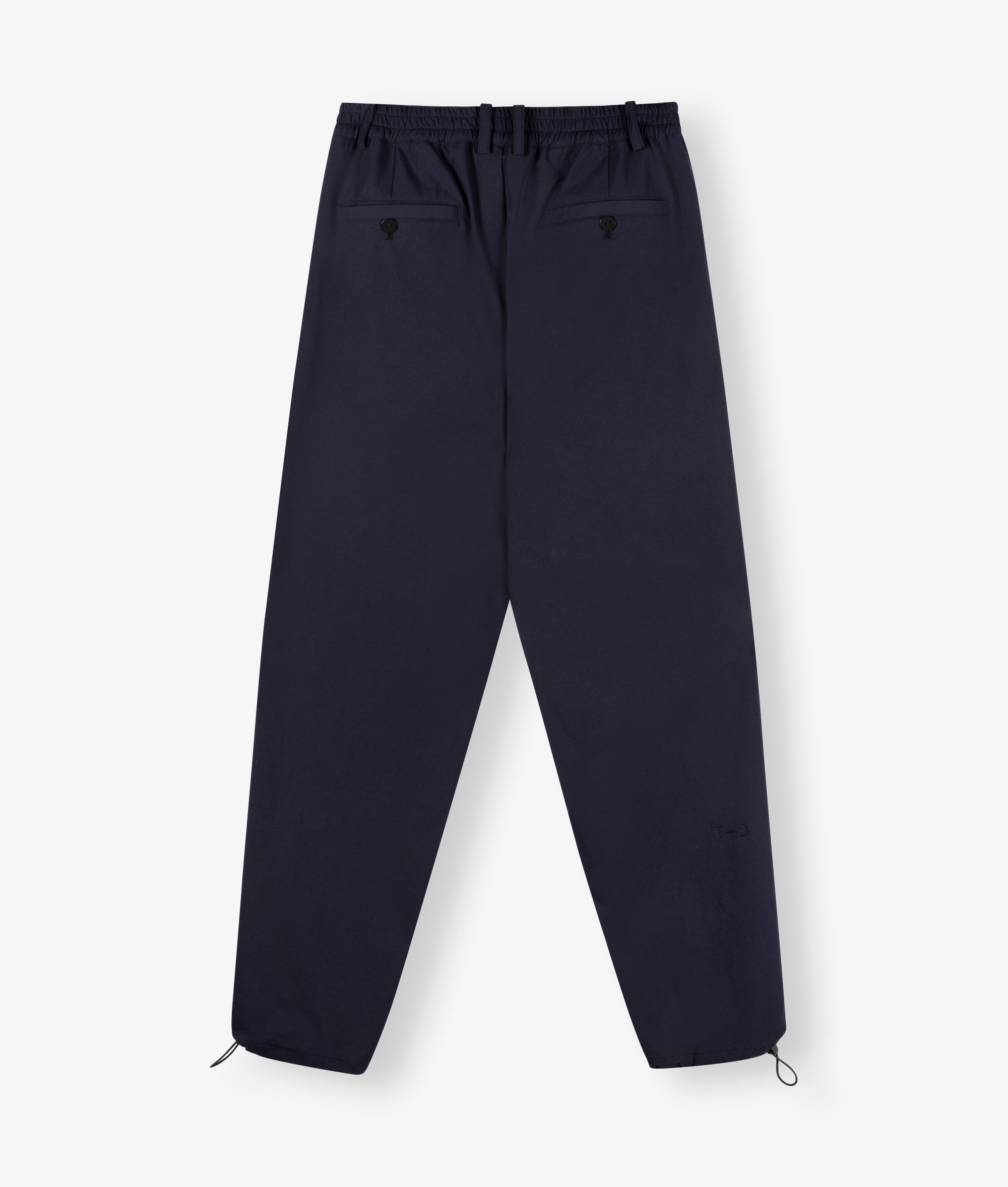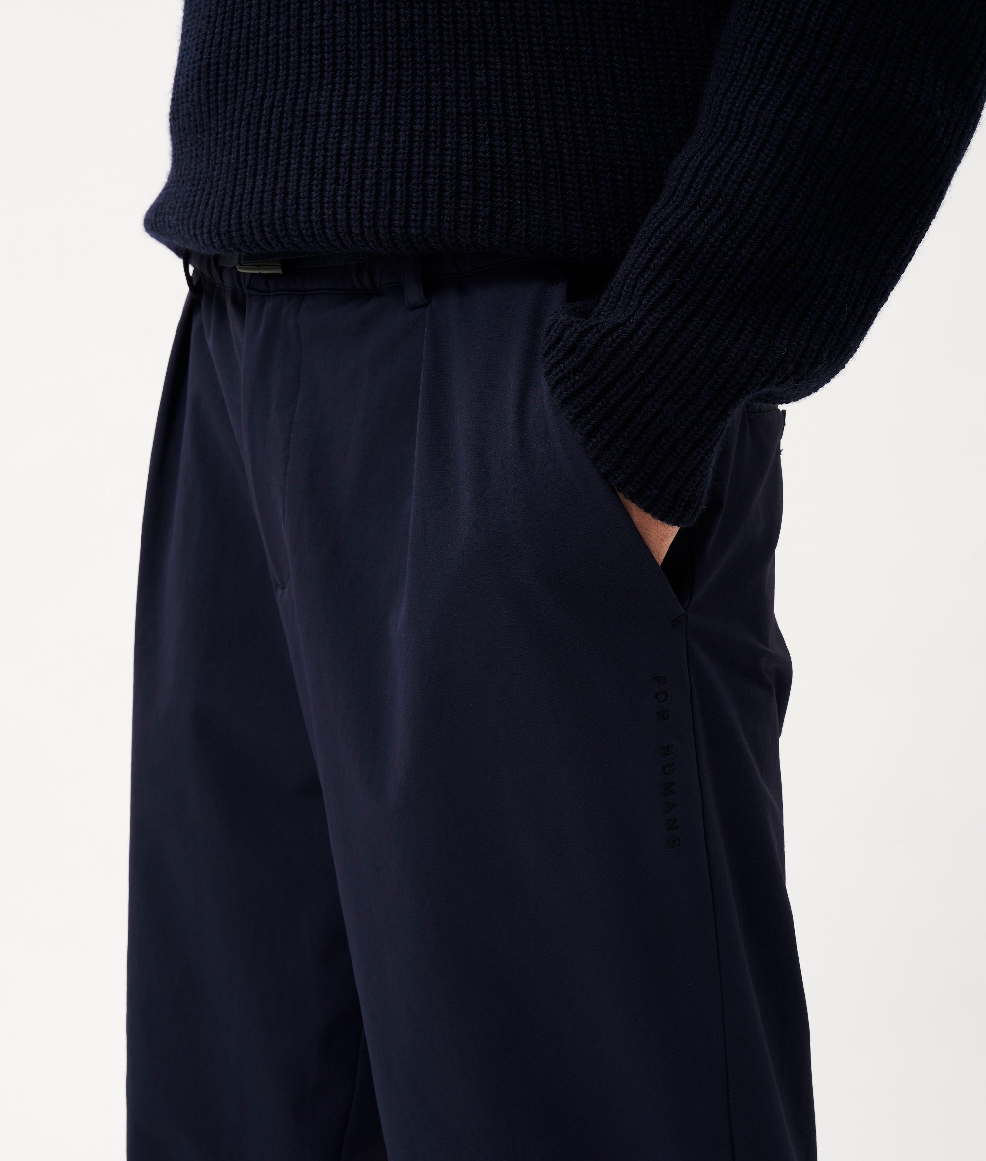 Relaxed fit stretch tech pants. Features an elastic waistband with press stud and zipper closure, a fixed belt at the front with clip closure, belt loops, slanted side pockets at the front, invisible back pockets, elastic cuffs around the ankles, a ‘FOR HUMANS’ embroidery under the left side pocket and a ‘T-D’ embroidery on the right rear leg.|