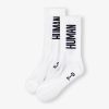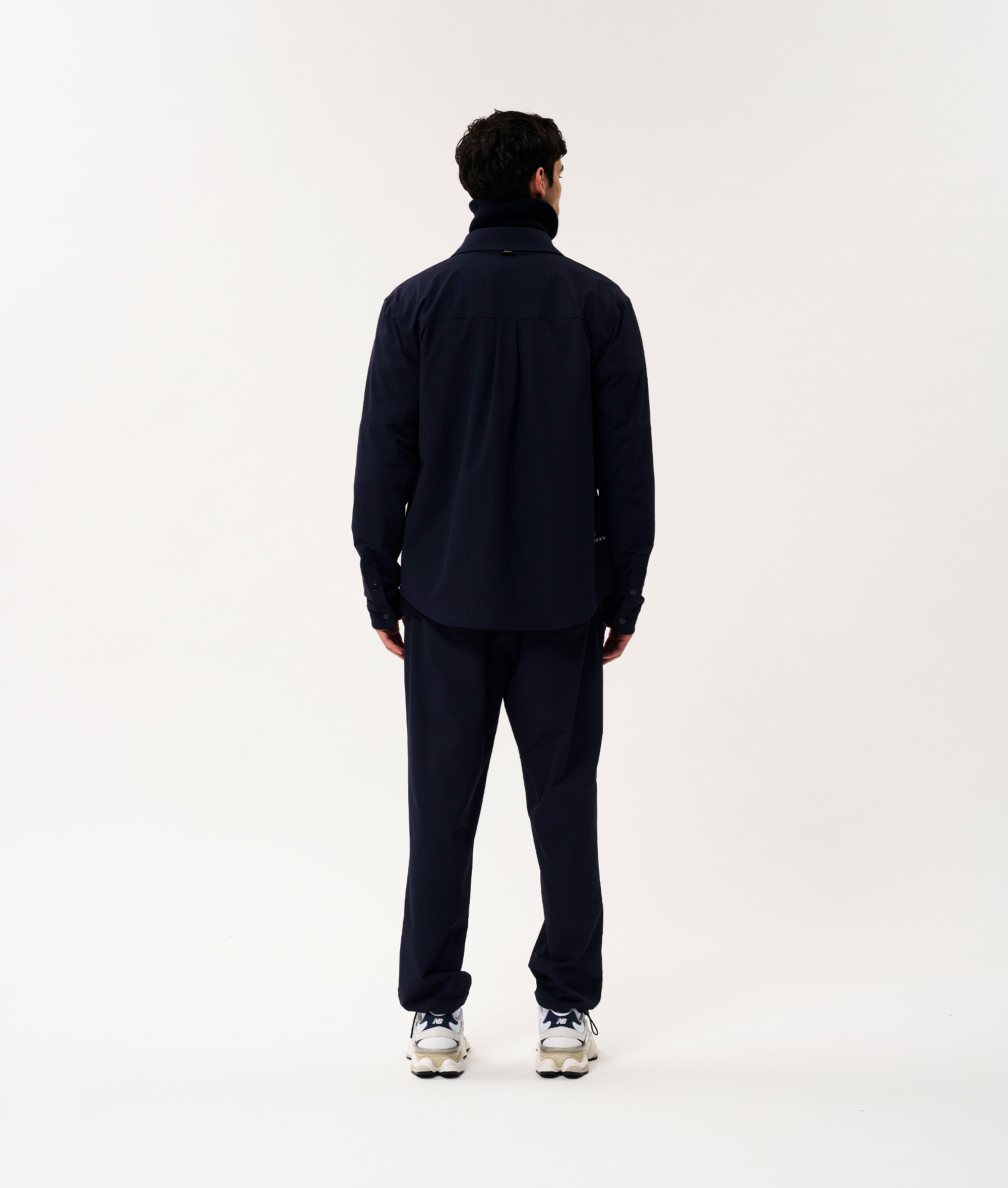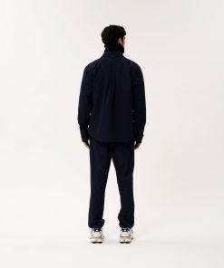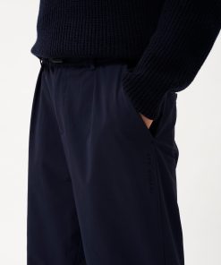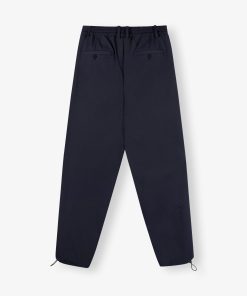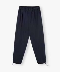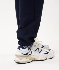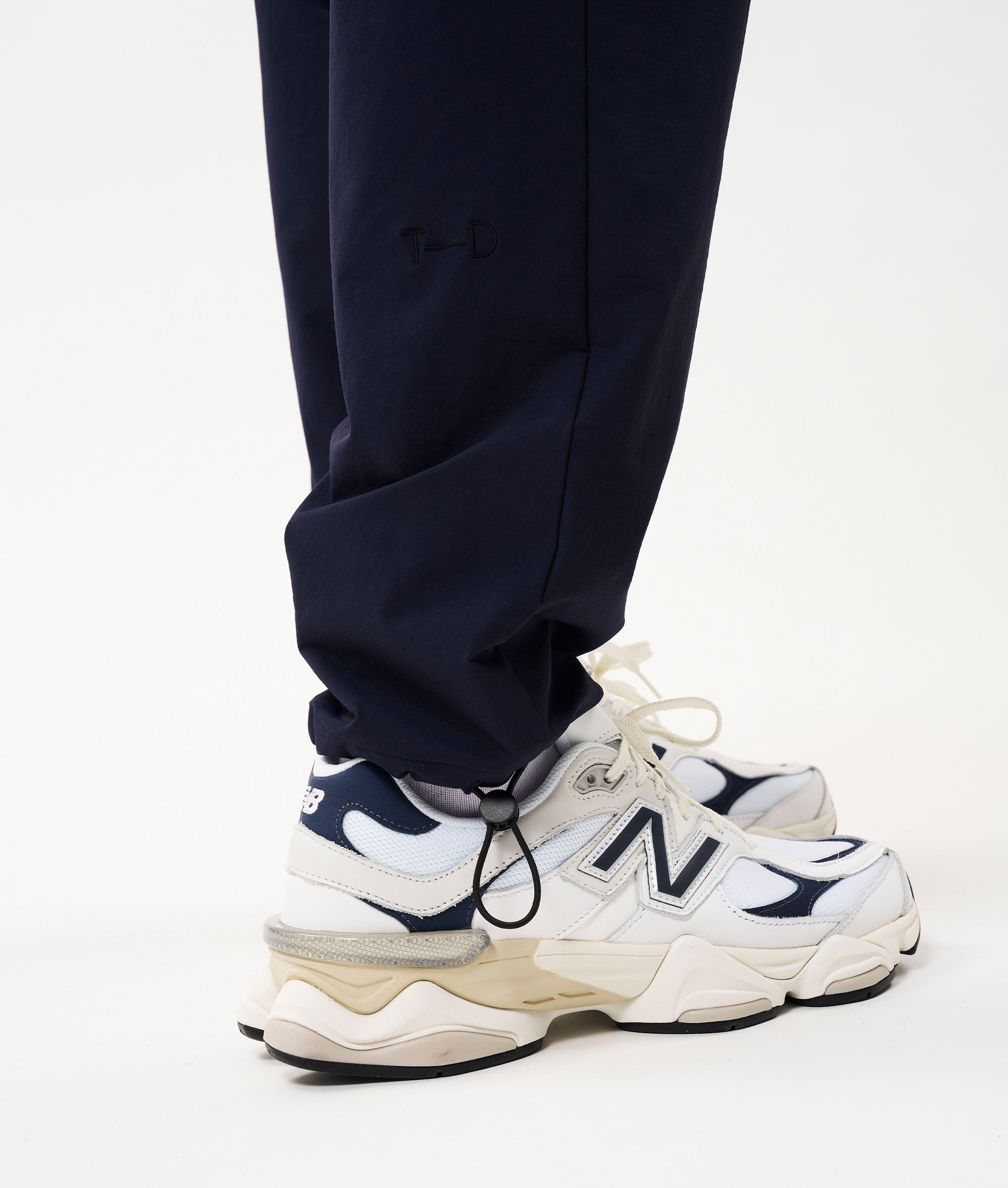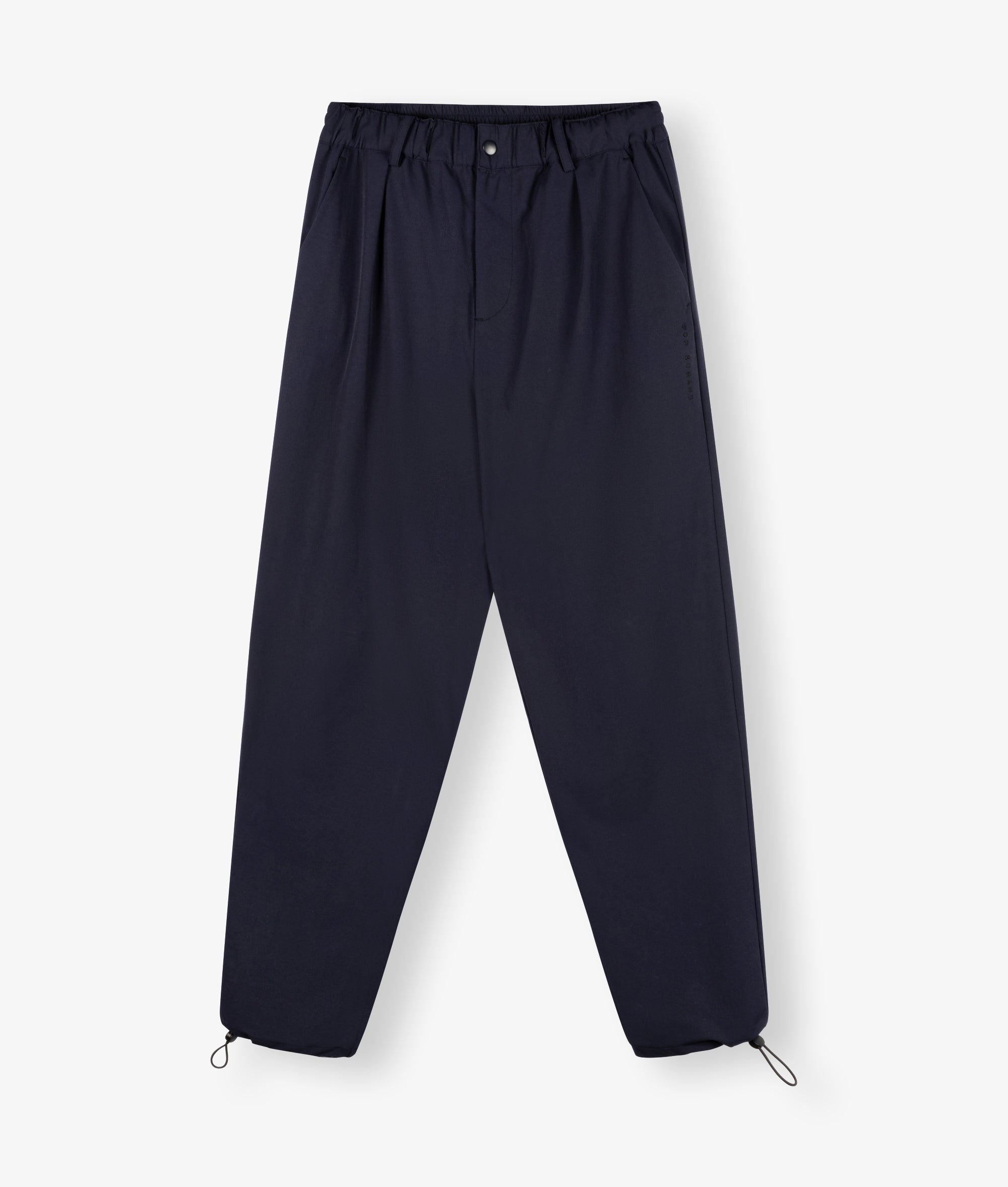 Relaxed fit stretch tech pants. Features an elastic waistband with press stud and zipper closure, a fixed belt at the front with clip closure, belt loops, slanted side pockets at the front, invisible back pockets, elastic cuffs around the ankles, a ‘FOR HUMANS’ embroidery under the left side pocket and a ‘T-D’ embroidery on the right rear leg.|