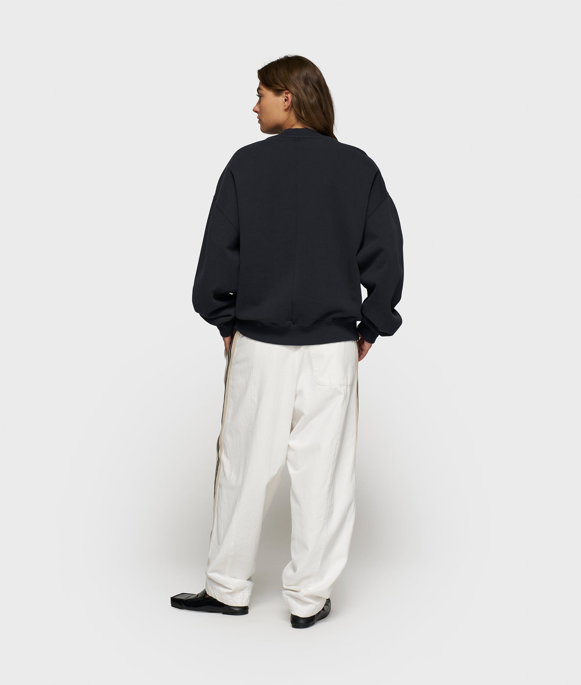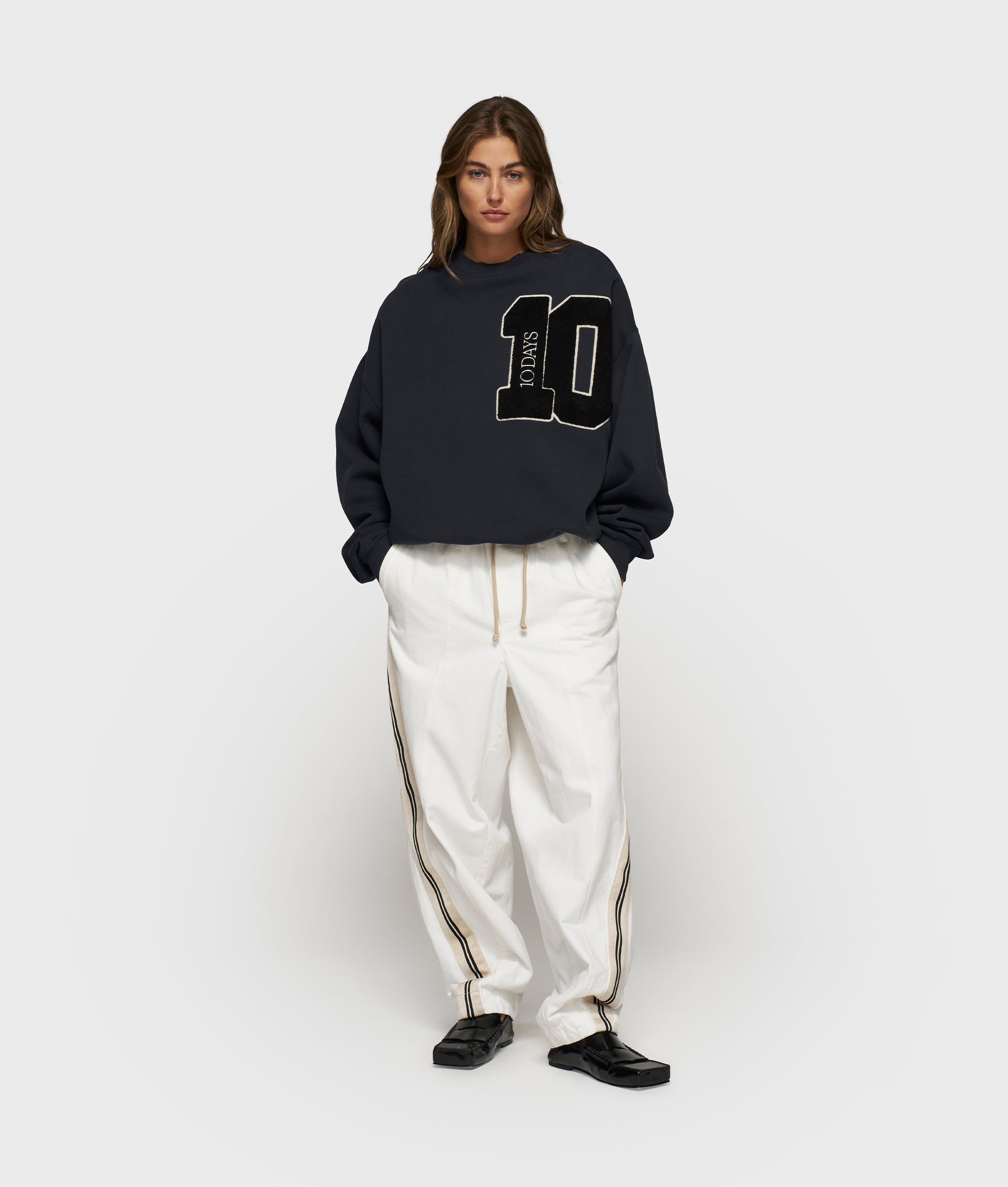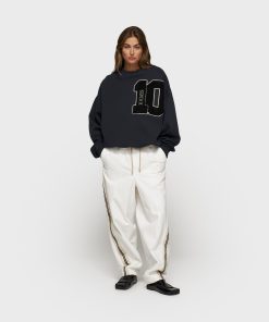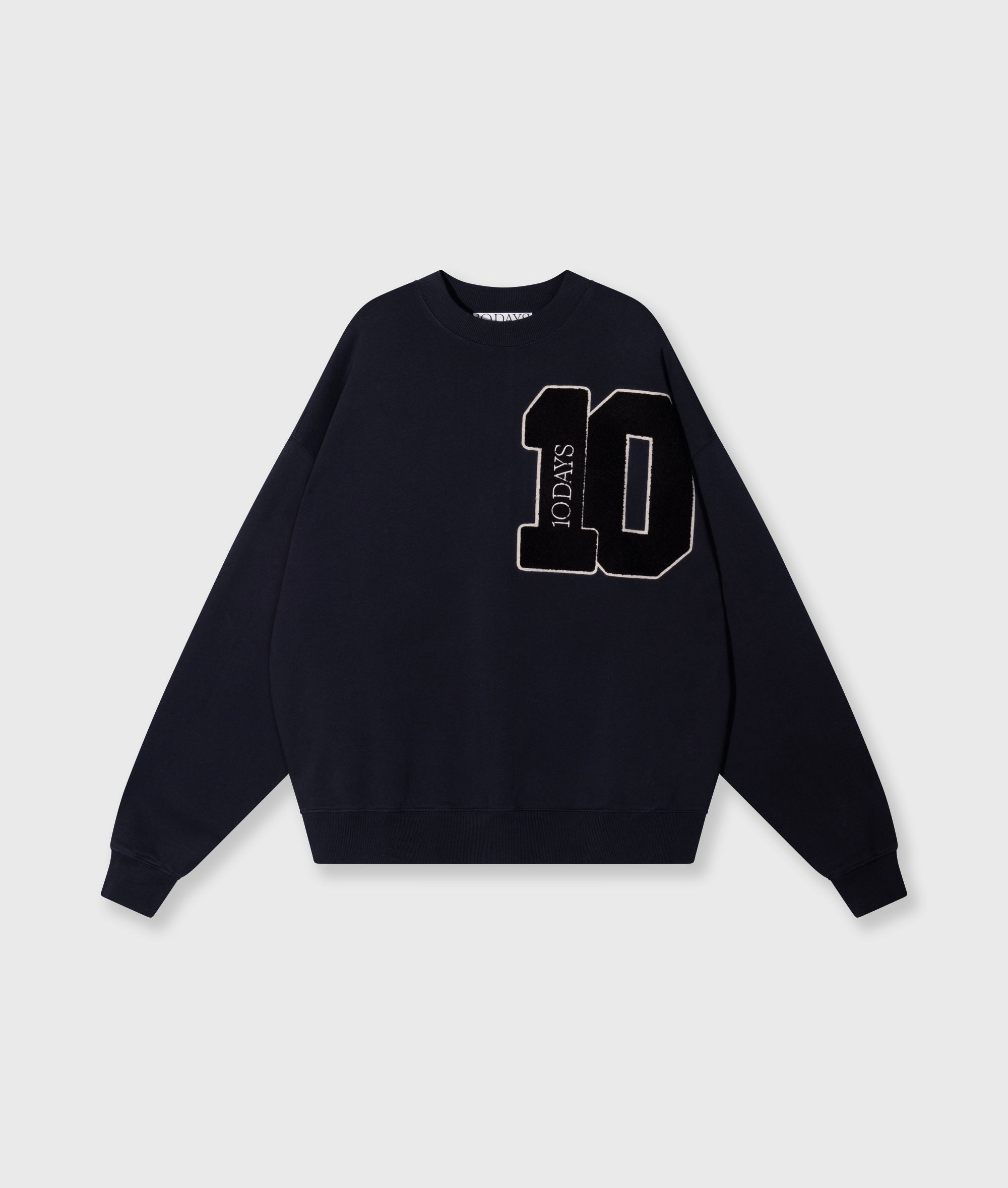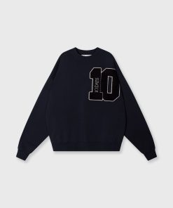 Oversized fit sweater, made from GOTS-certified organic cotton. Features ribbed trims, a mini stripes logo embroidery on the back and a big ’10’ patch on the left chest.|