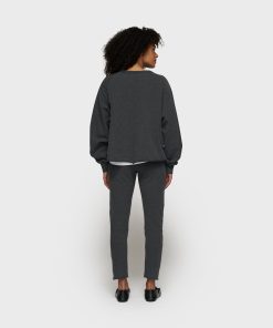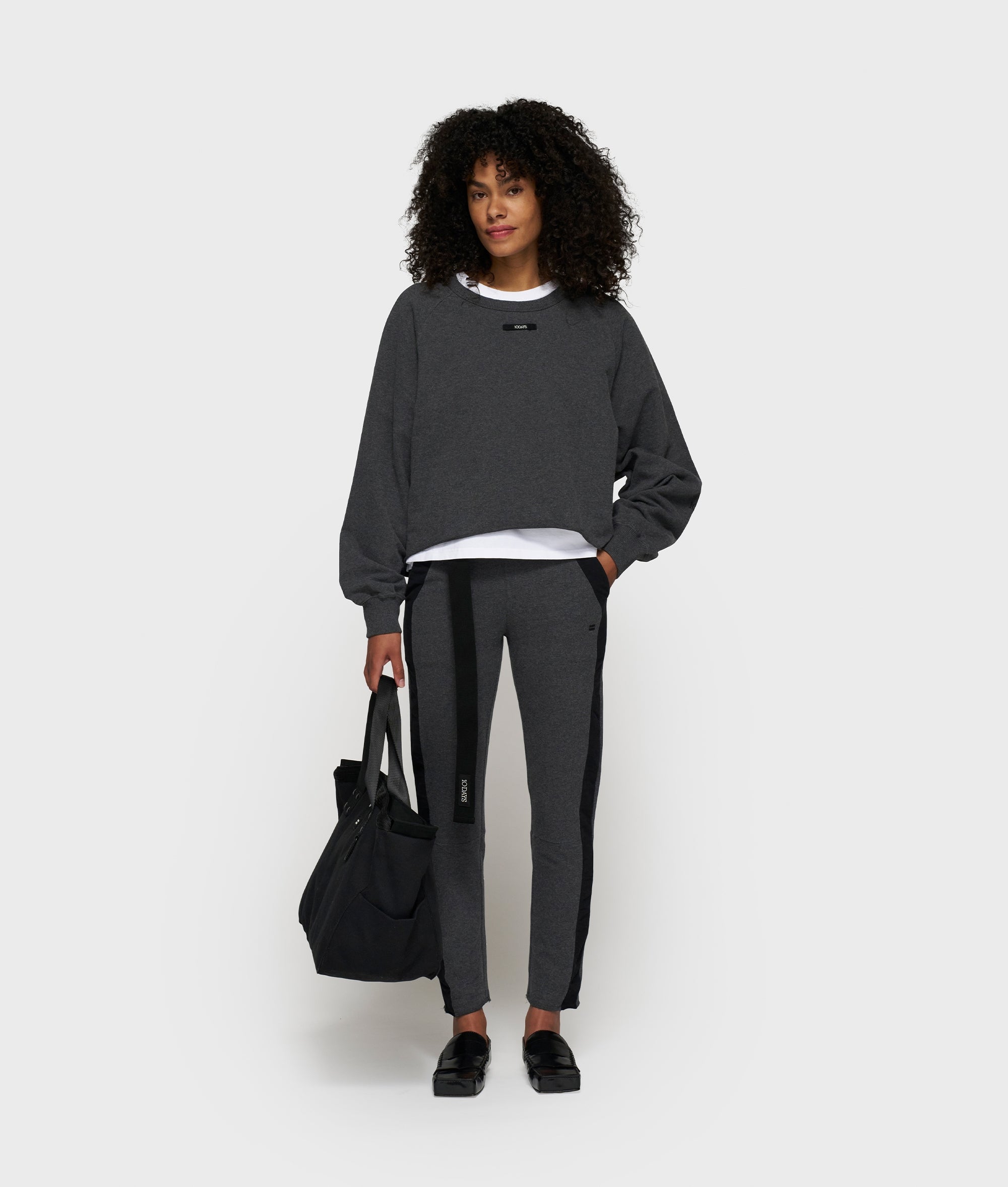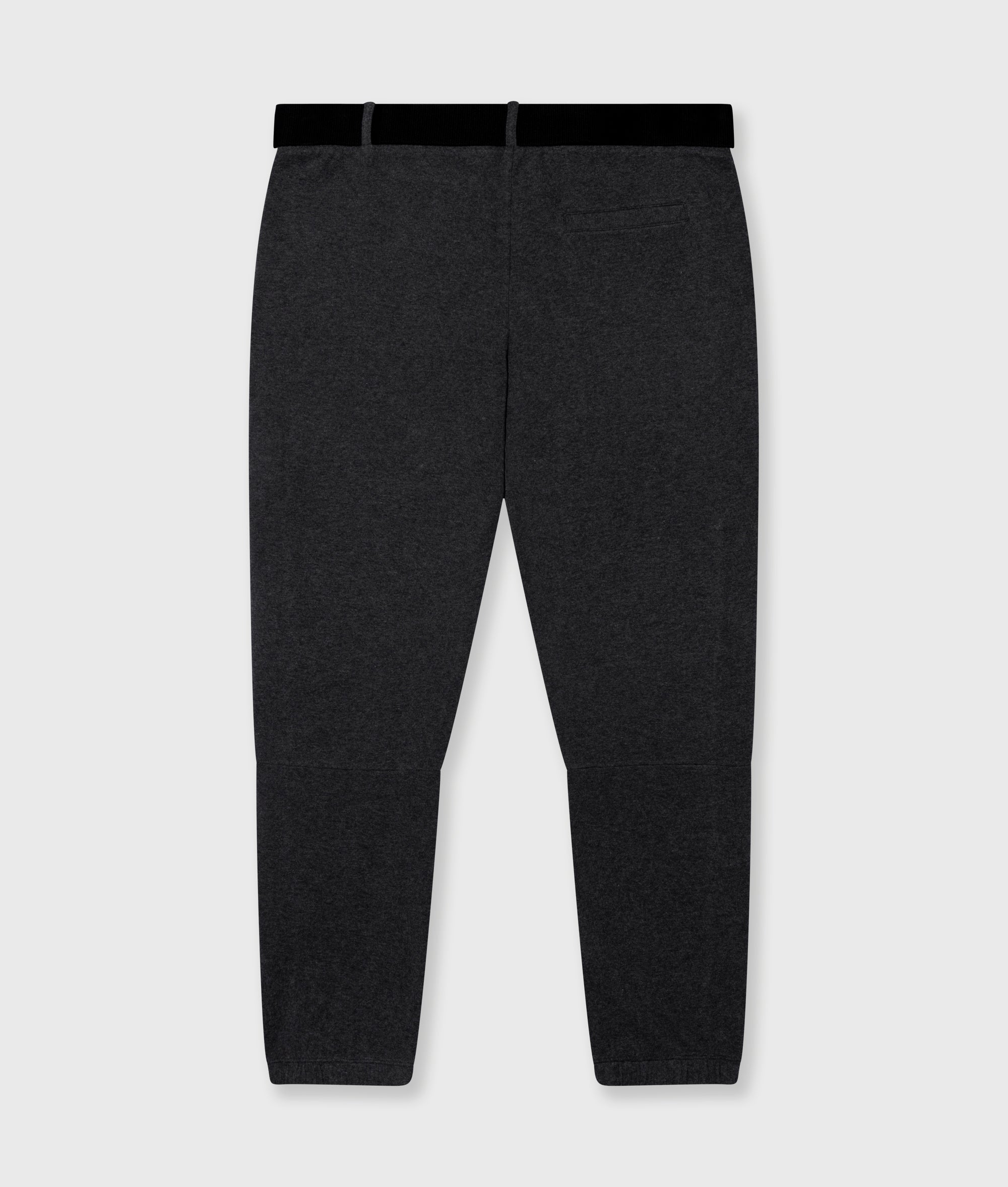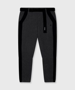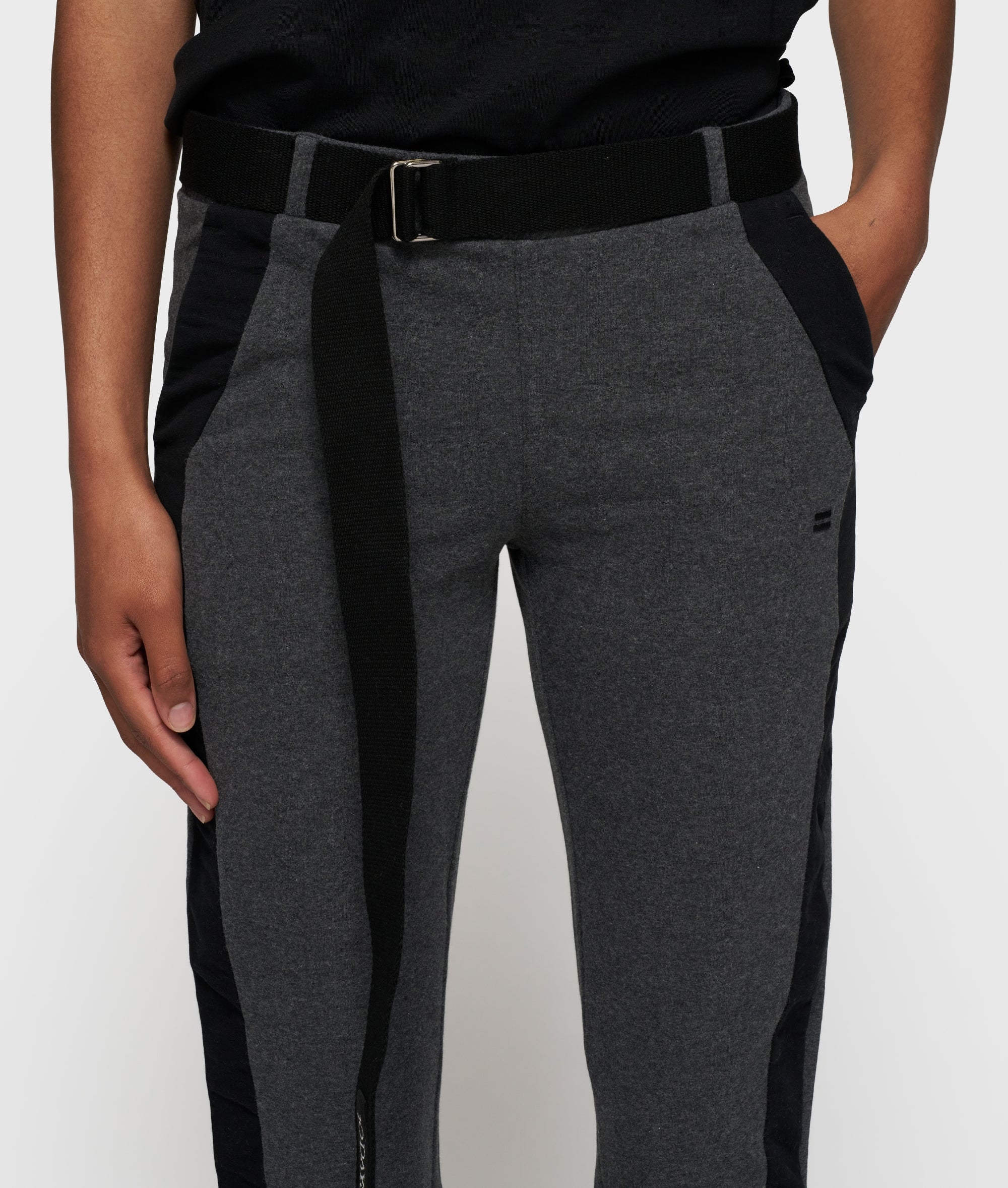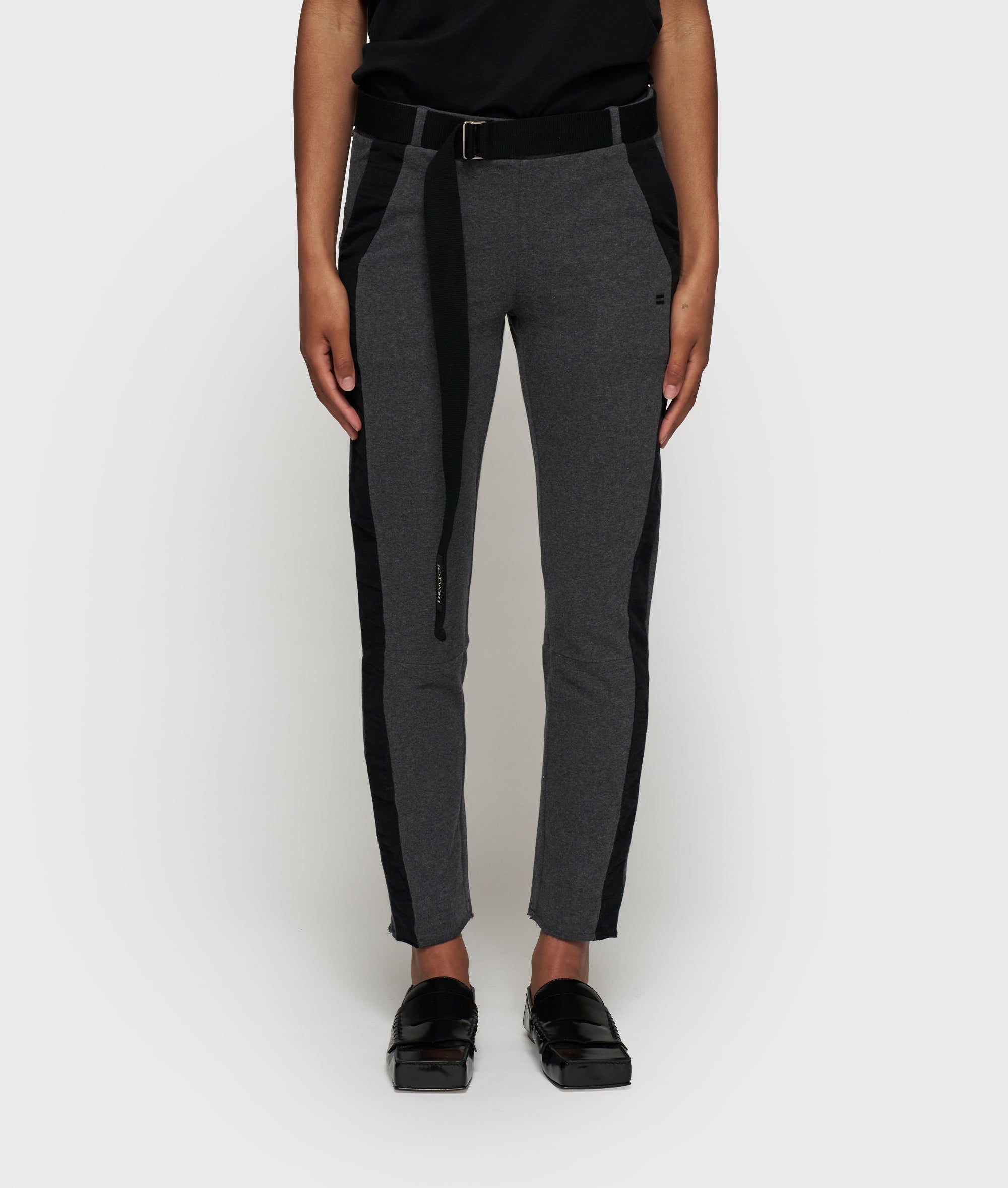Slim fit cropped jogger, made from soft cotton. Designed with an elasticated waistband with belt, slanted front pockets, a fake back pocket, a side tape insert, raw edge hem and a ‘mini stripes’ embroidery below the left pocket.|