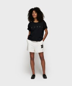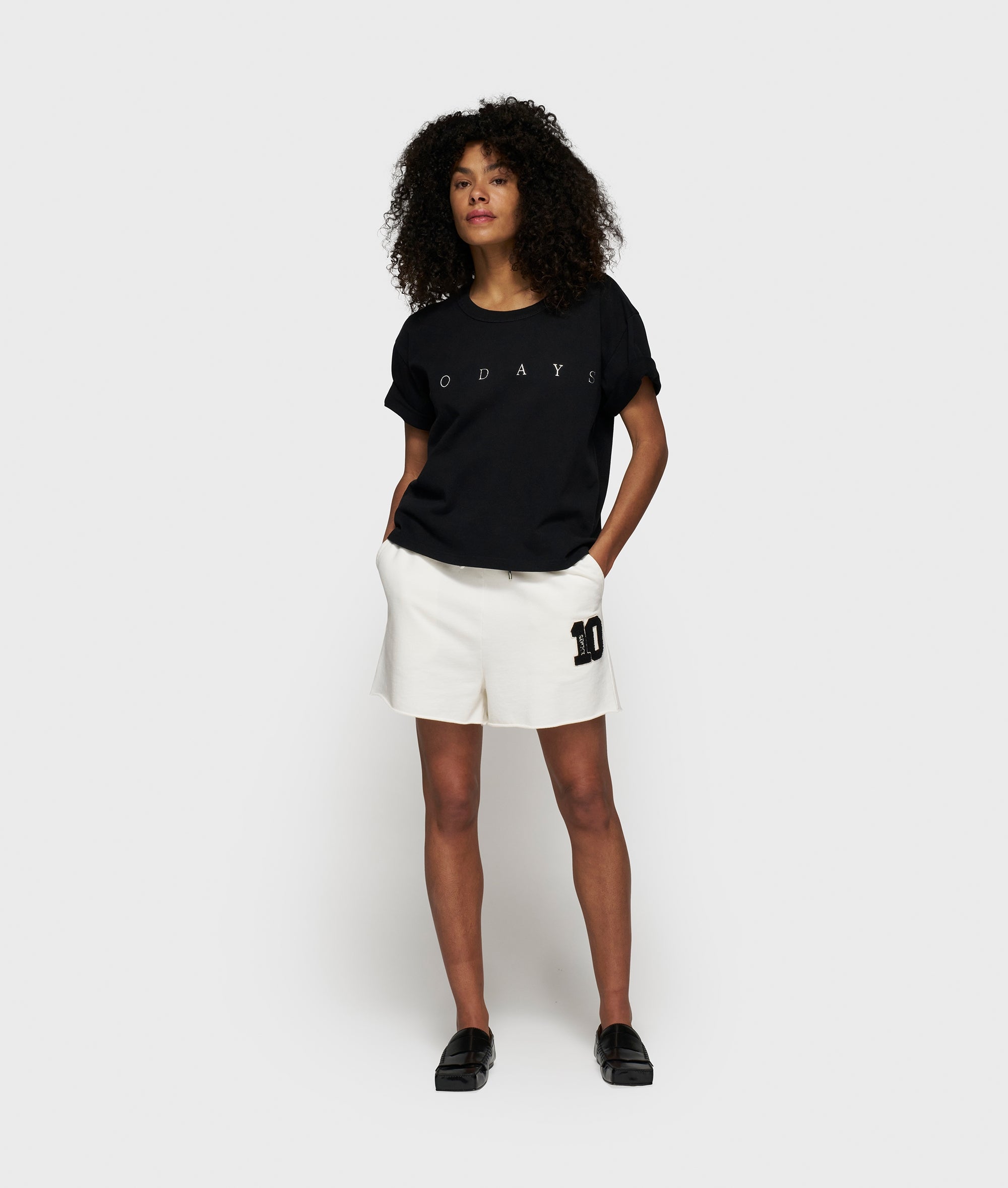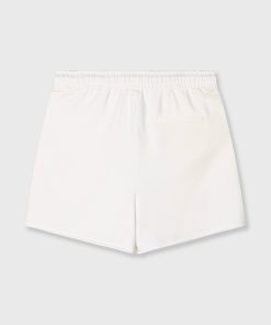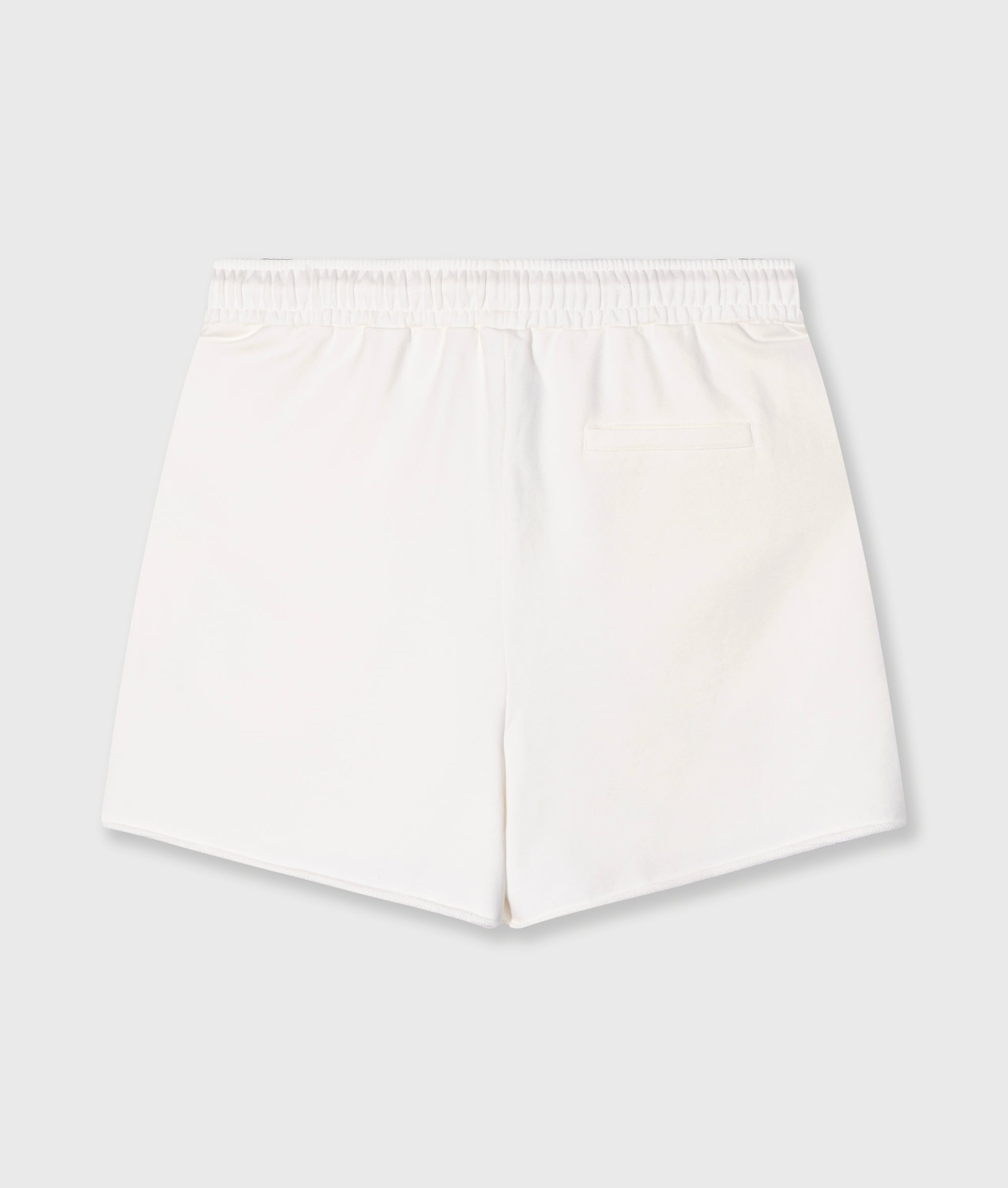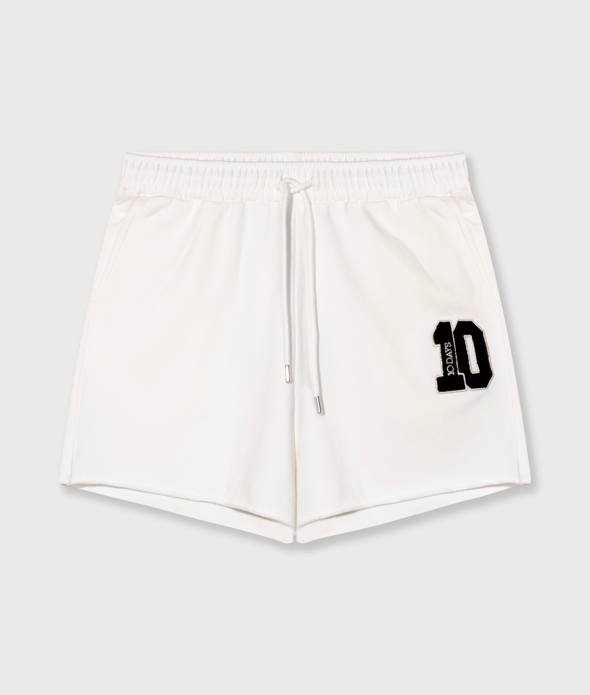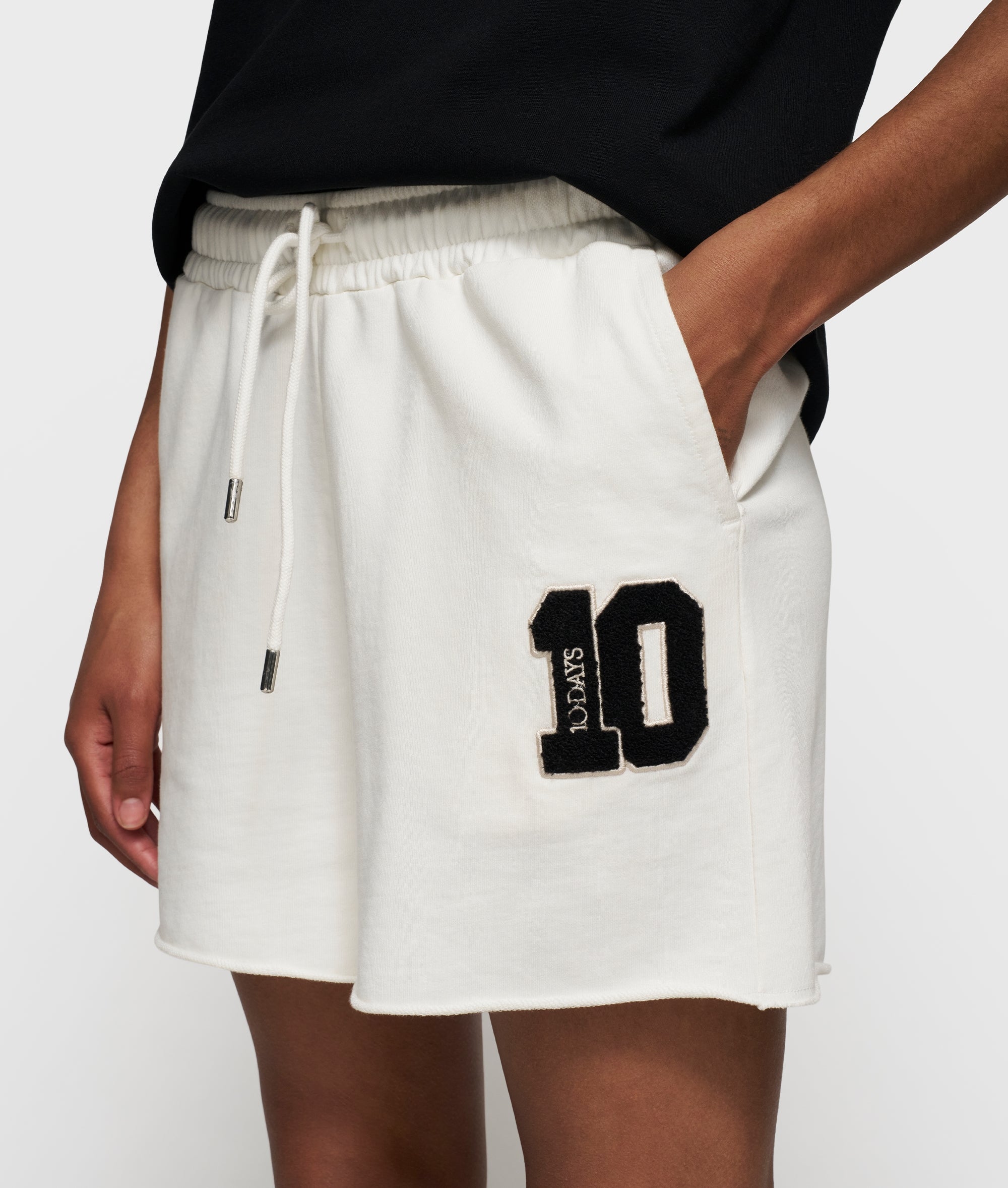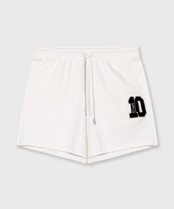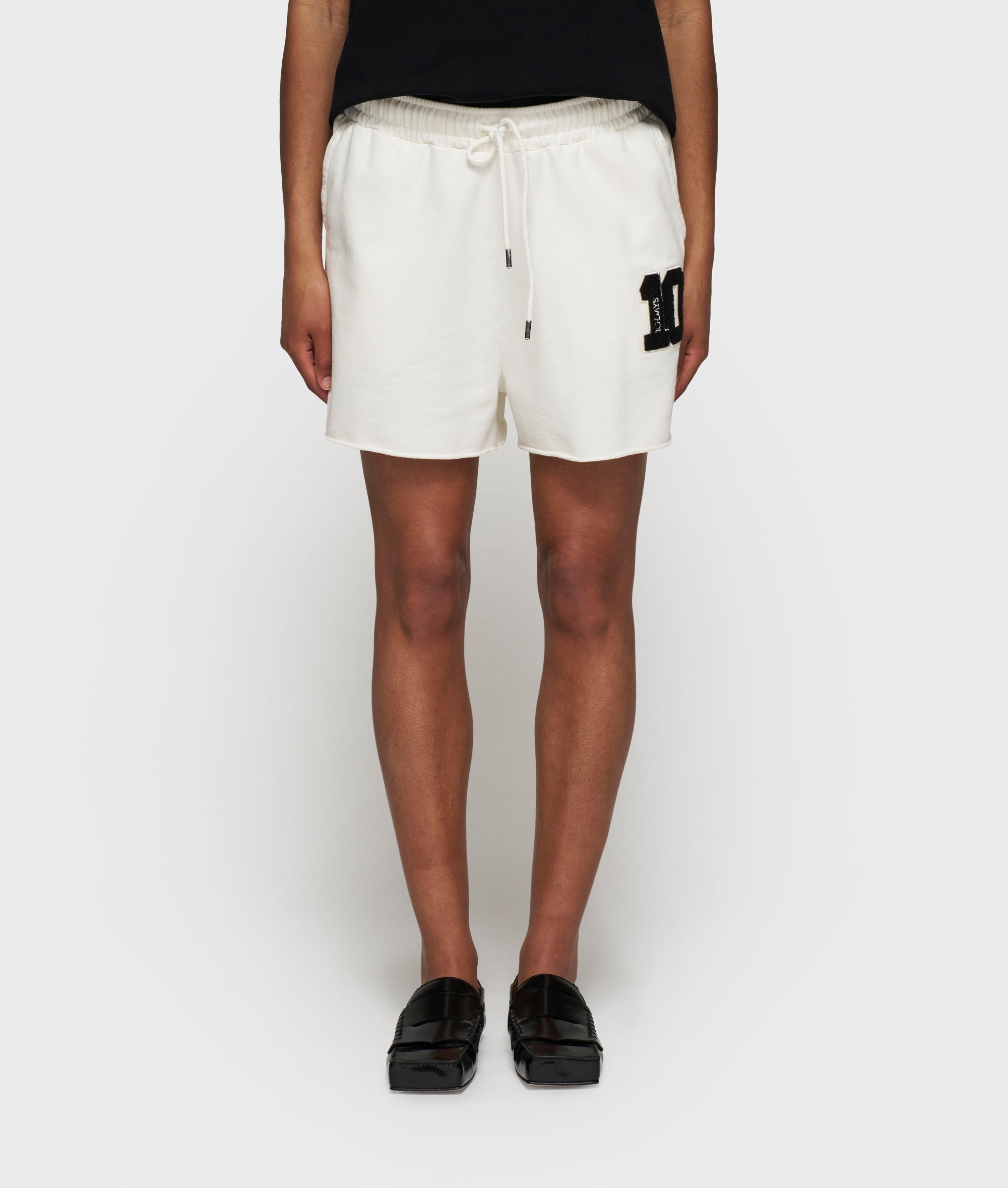 Relaxed fit fleece shorts made from soft cotton. Features an elasticated waistband with drawstring, slanted side pockets, a fake back pocket, trouser legs with unfinished edges and a ’10’ medium patch on the left front.|