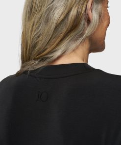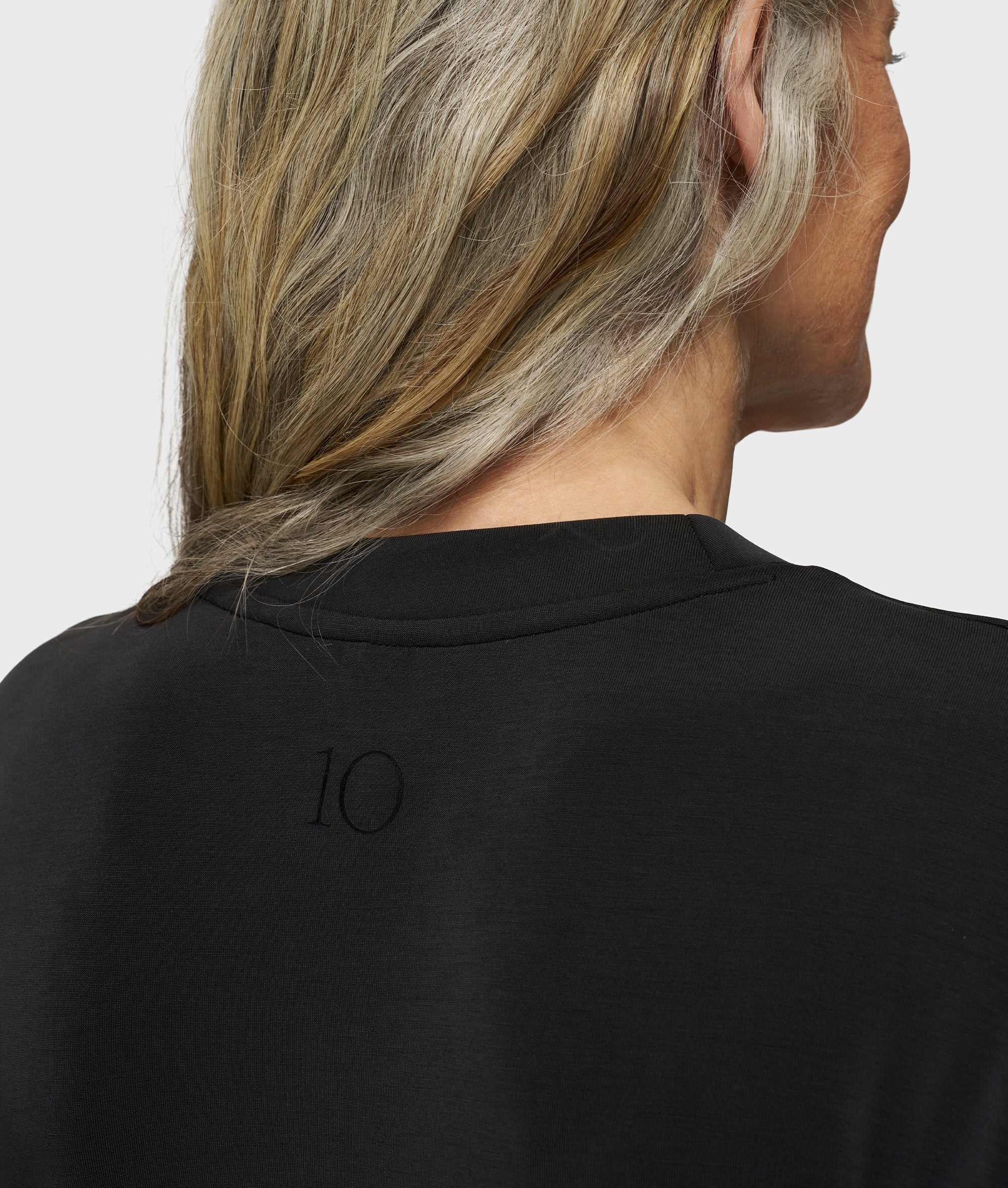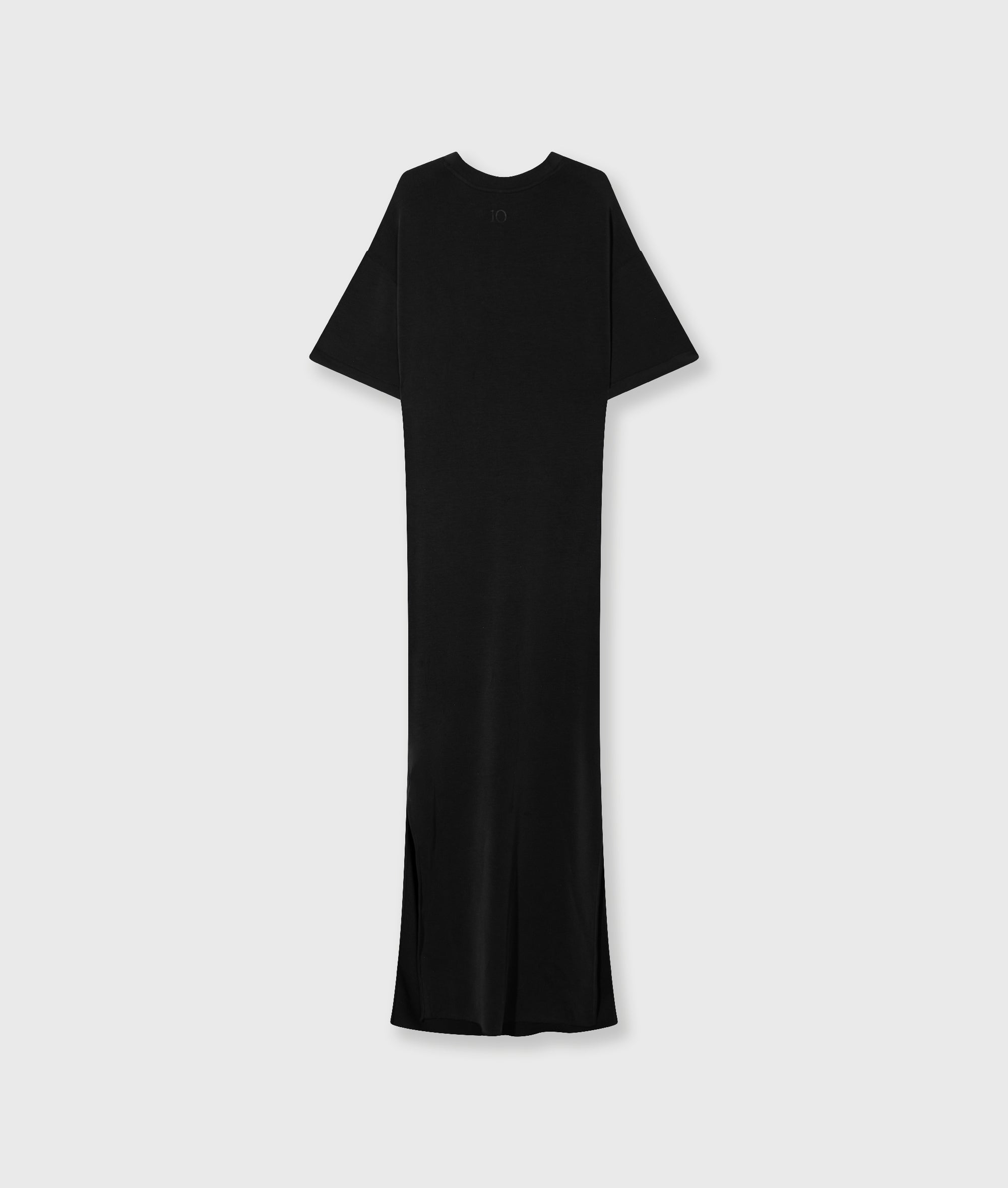 Regular fit midi T-shirt dress made from super-soft modal polyester blend. Features a pleat detail at the left side, side hem slits, and a ’10’ monogram foil print at the back.|