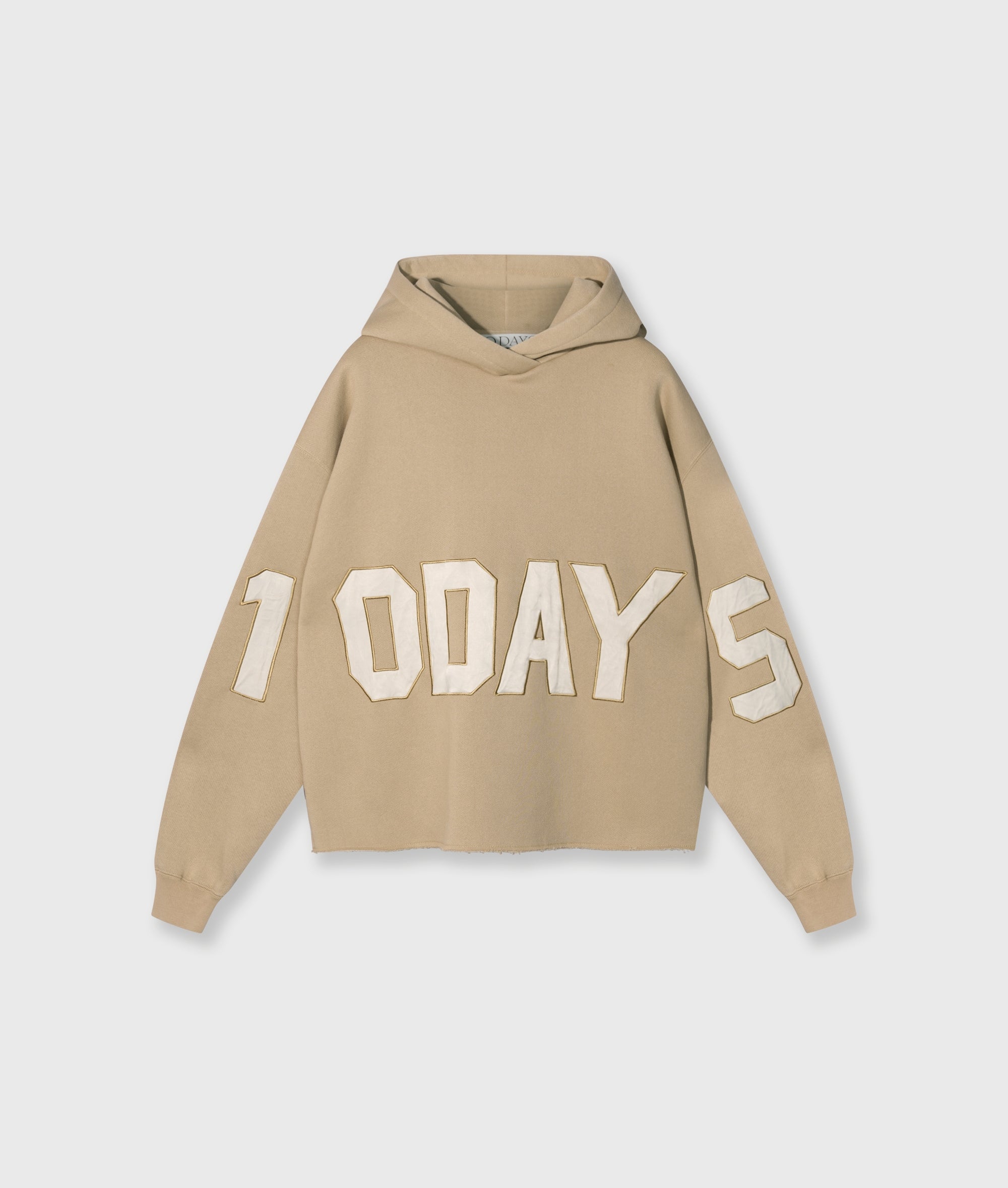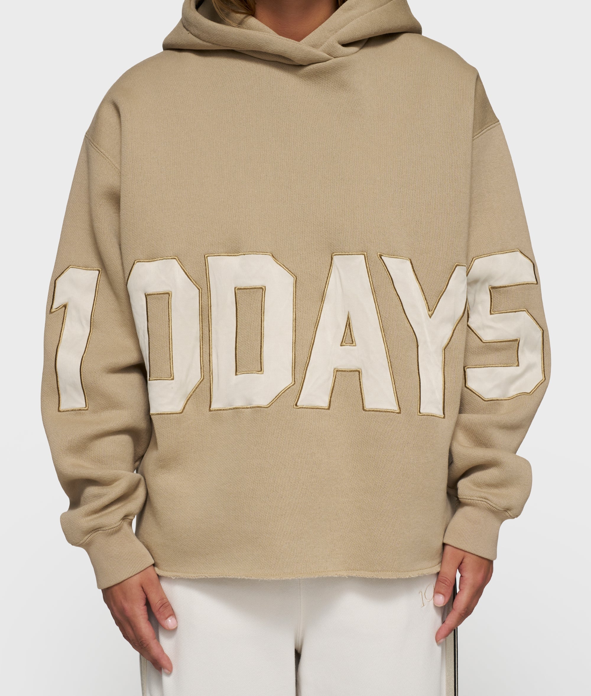Relaxed fit statement hoodie, made from a cotton and polyester blend. Features a large 10DAYS logo patch on the sleeves and front body, a hood, ribbed cuffs and a raw edge hem.|