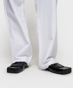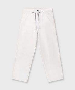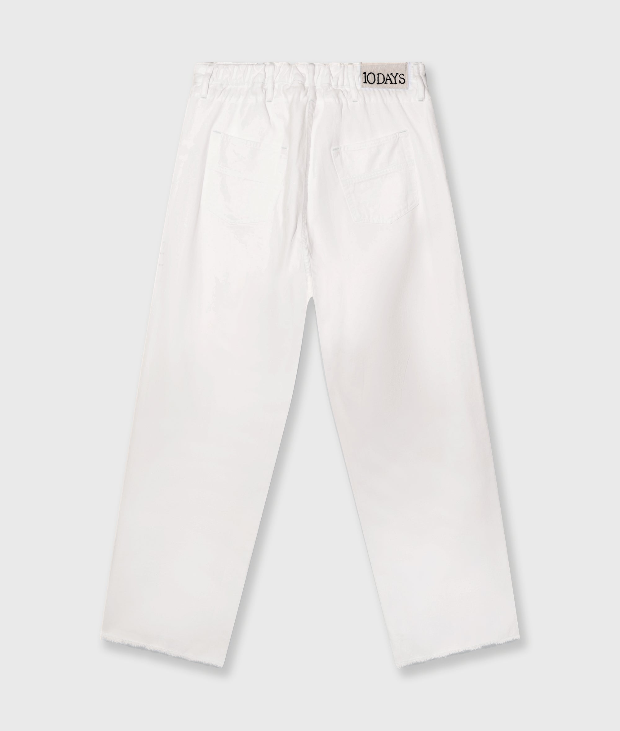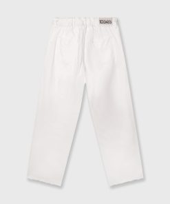 Regular fit straight leg trousers made from soft GOTS-certified organic cotton. Features a drawstring waistband, a button and zip fastening, belt loops, raw edge trouser legs, patch back pockets and a ’10’ monogram embroidery under the left front pocket.|
