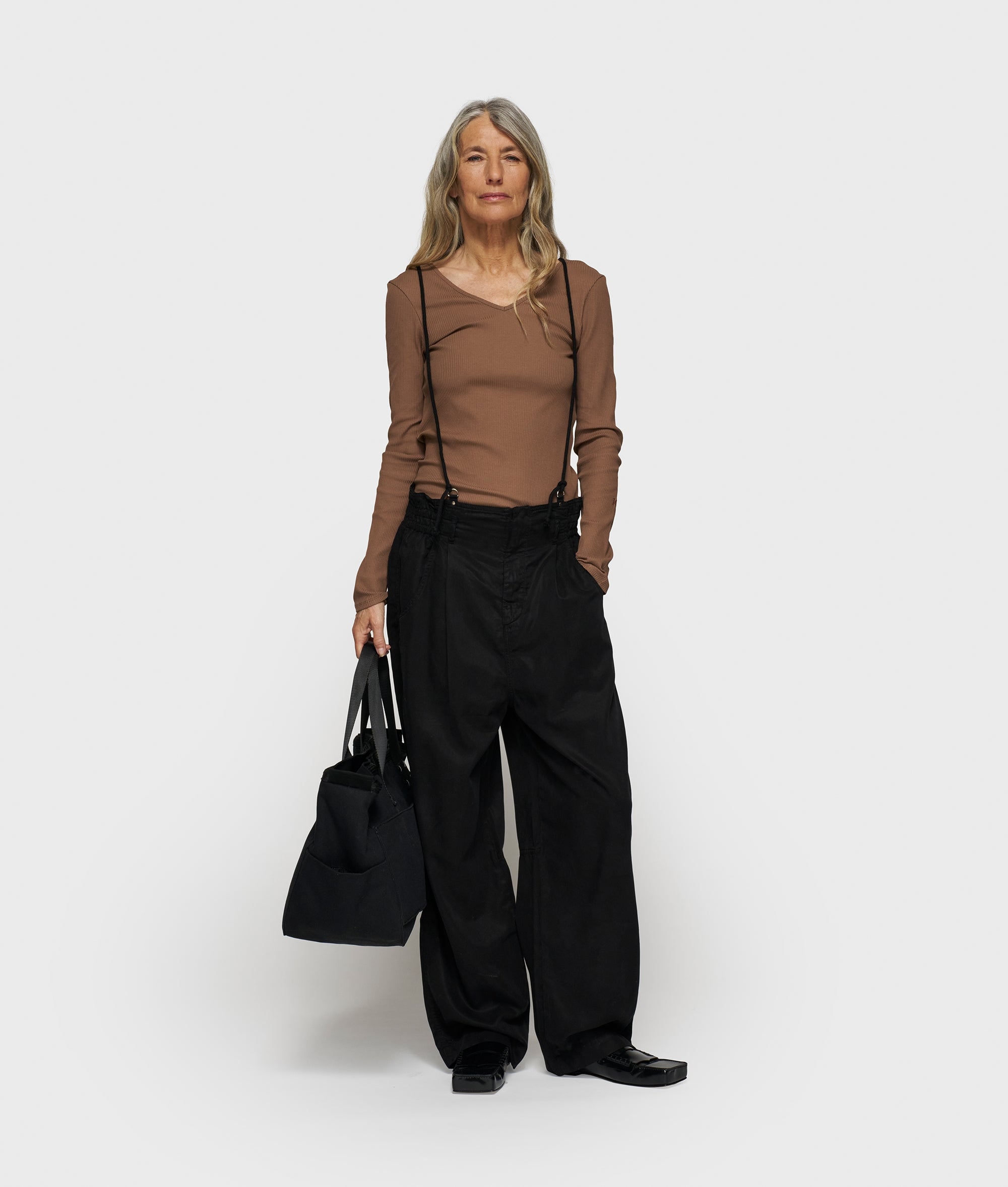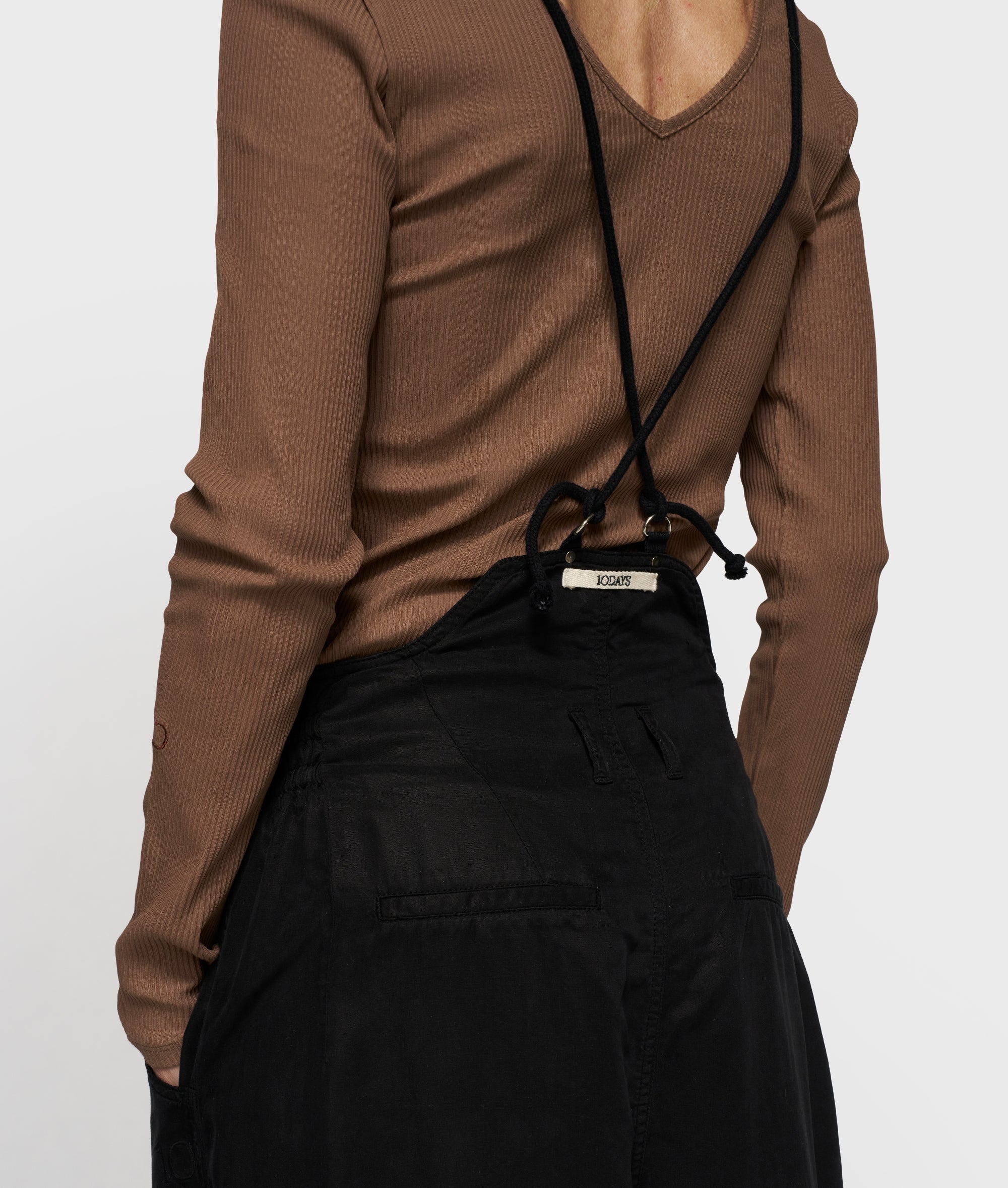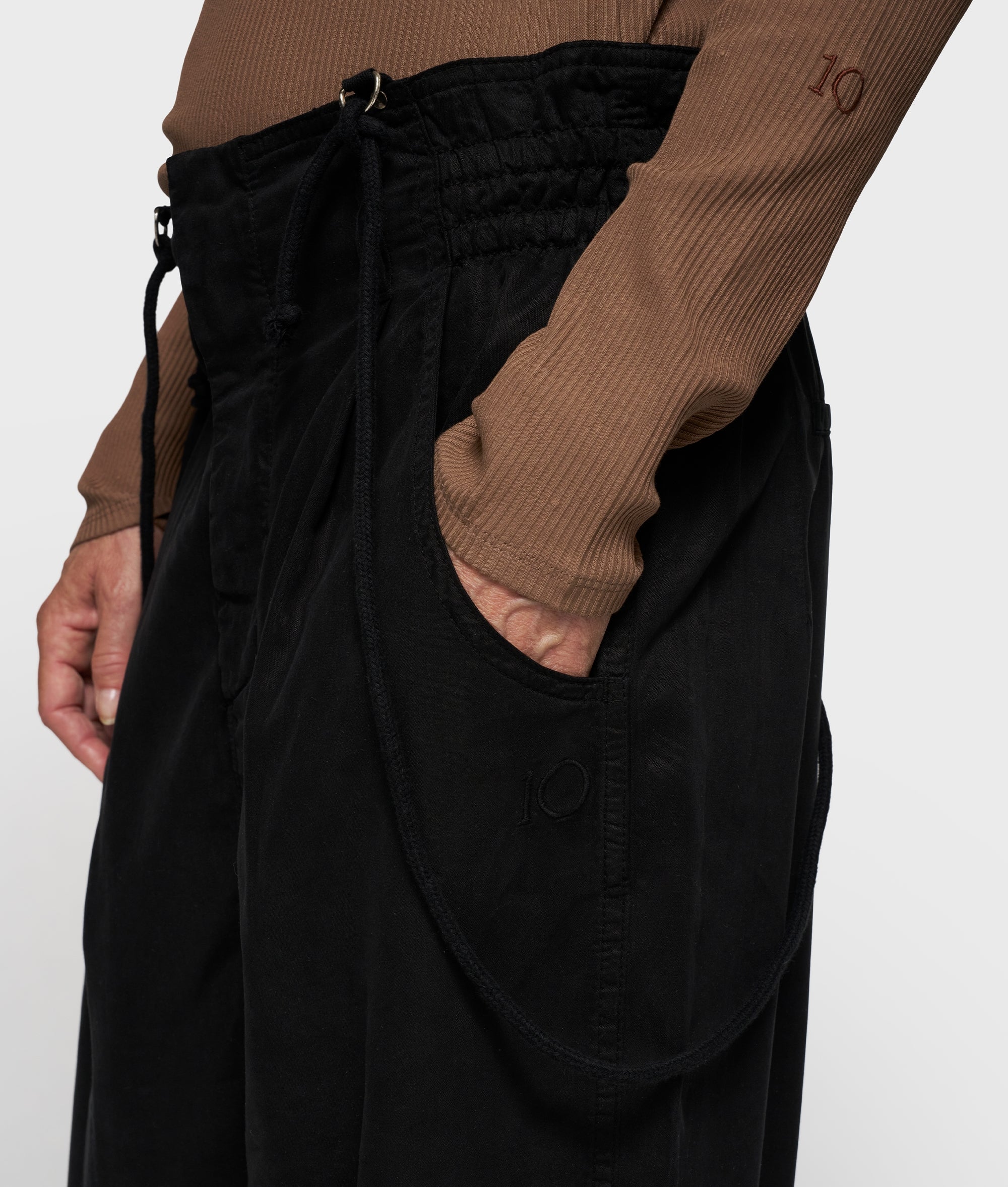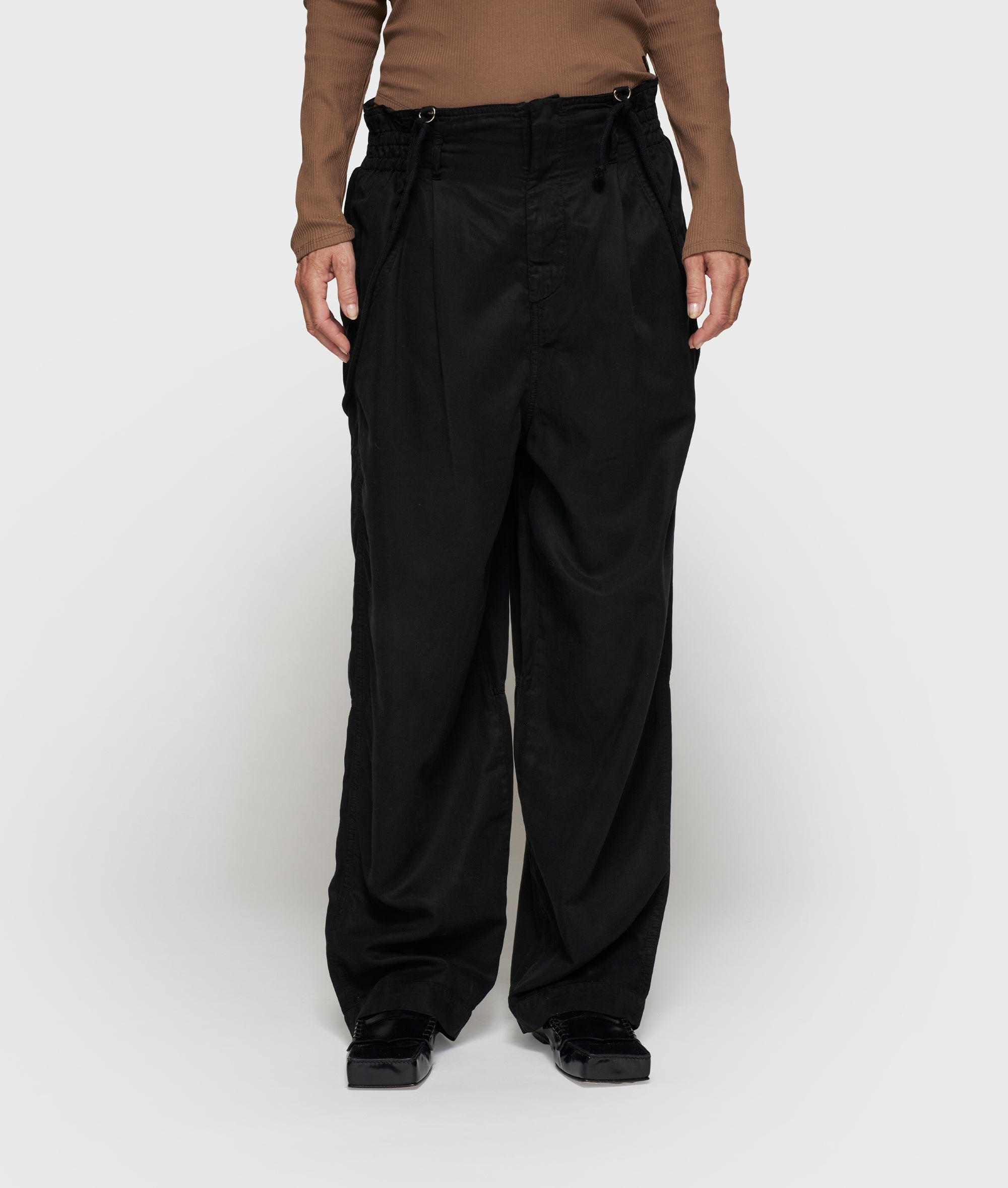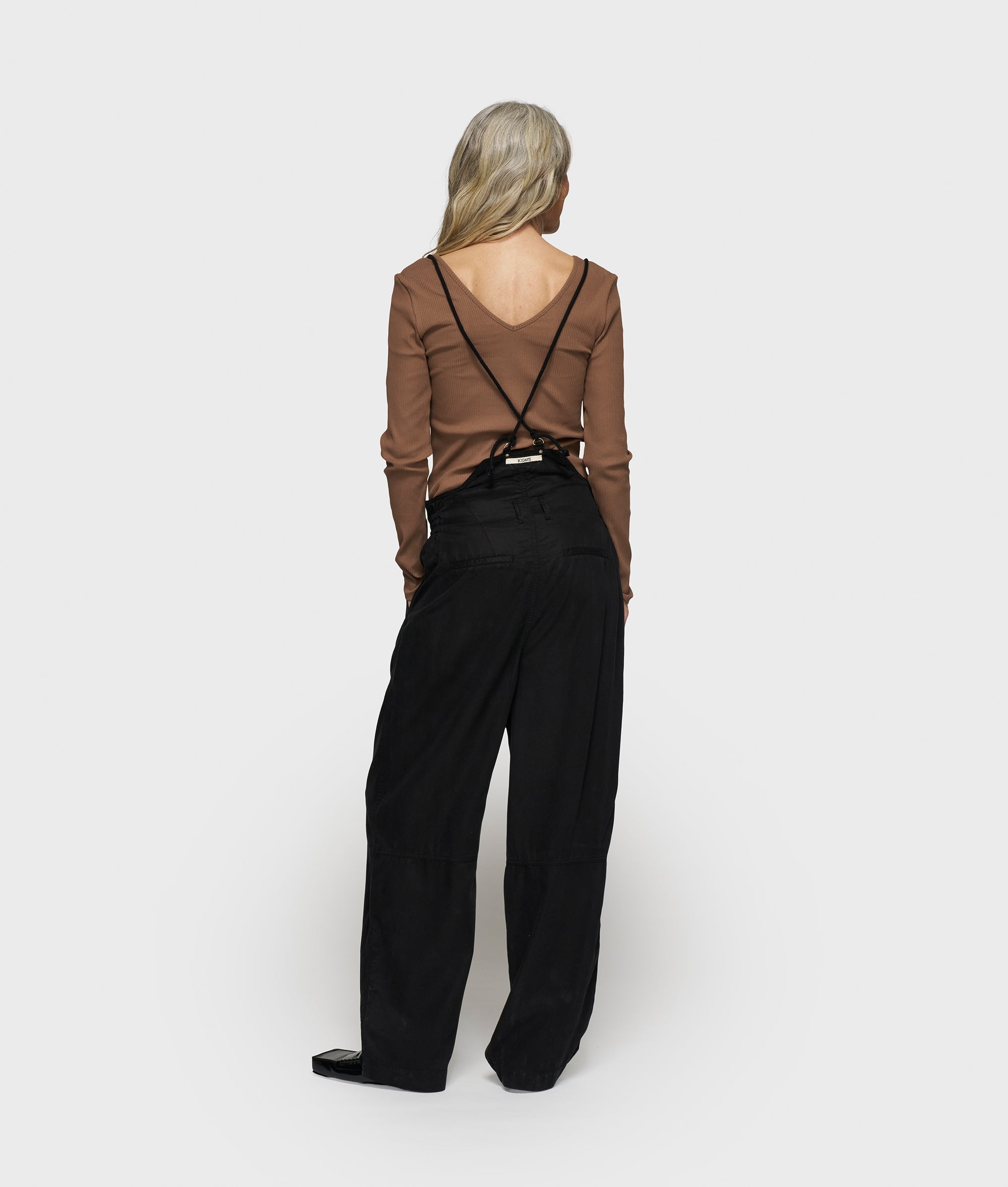 Regular fit salopette made from washed tencel twill with a mid-rise elasticated waistband. Designed with adjustable shoulder straps, slanted side pockets, faux back pockets and a monogram embroidery at the front left. Finished with a higher waistband at the back, pleat detailing beneath the belt loops and a concealed metal zip closure.|