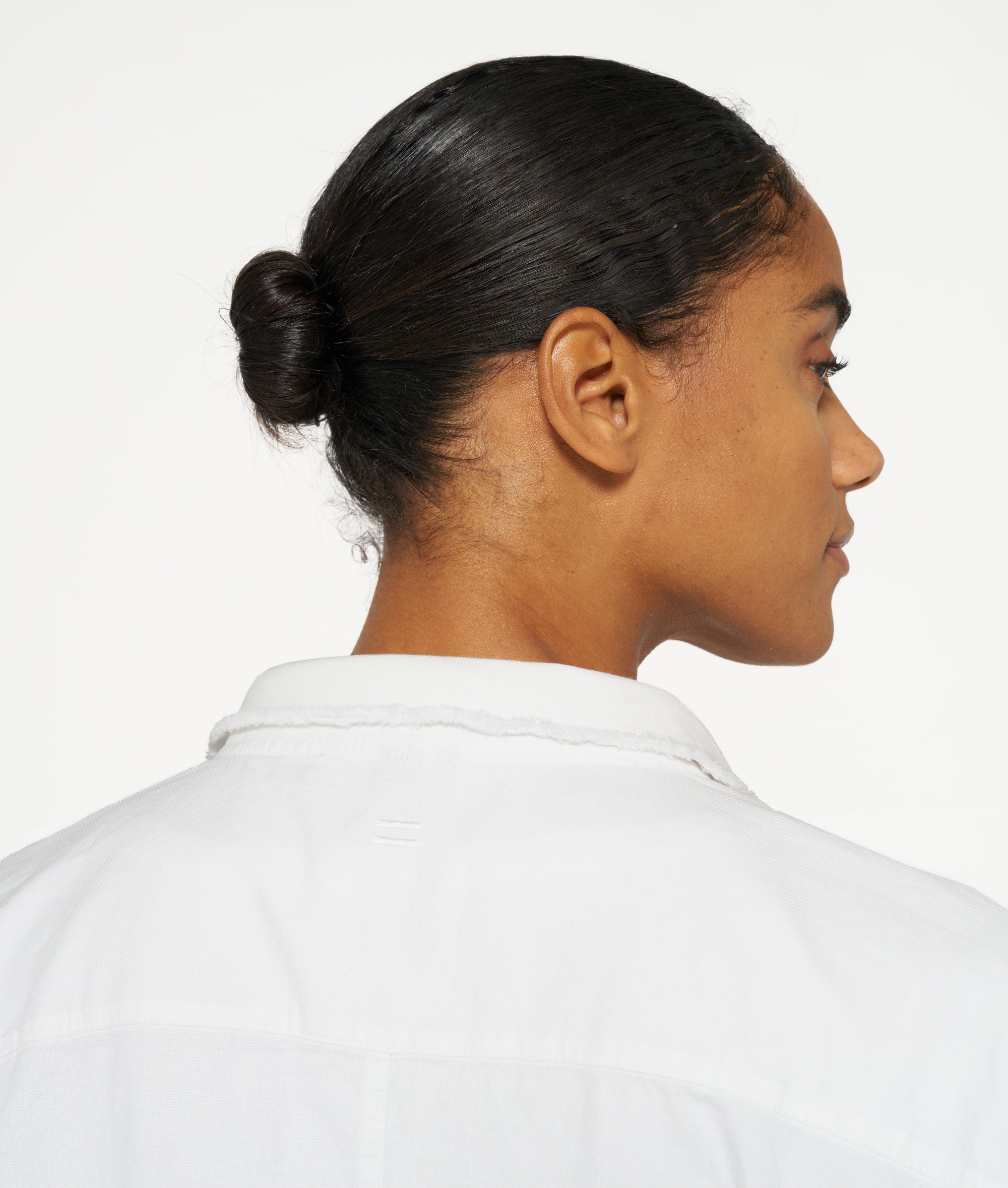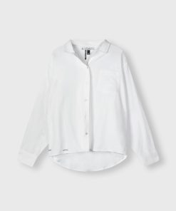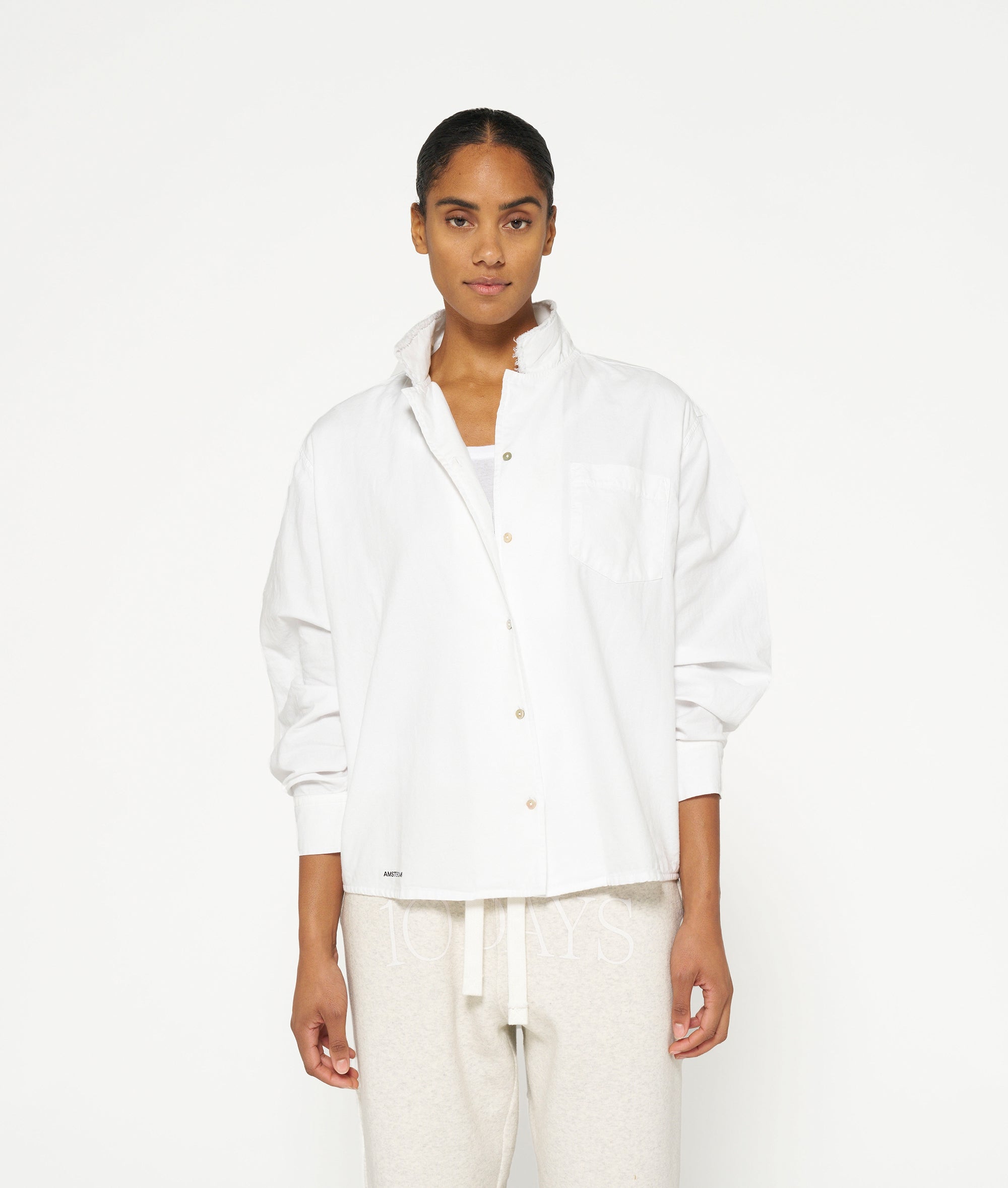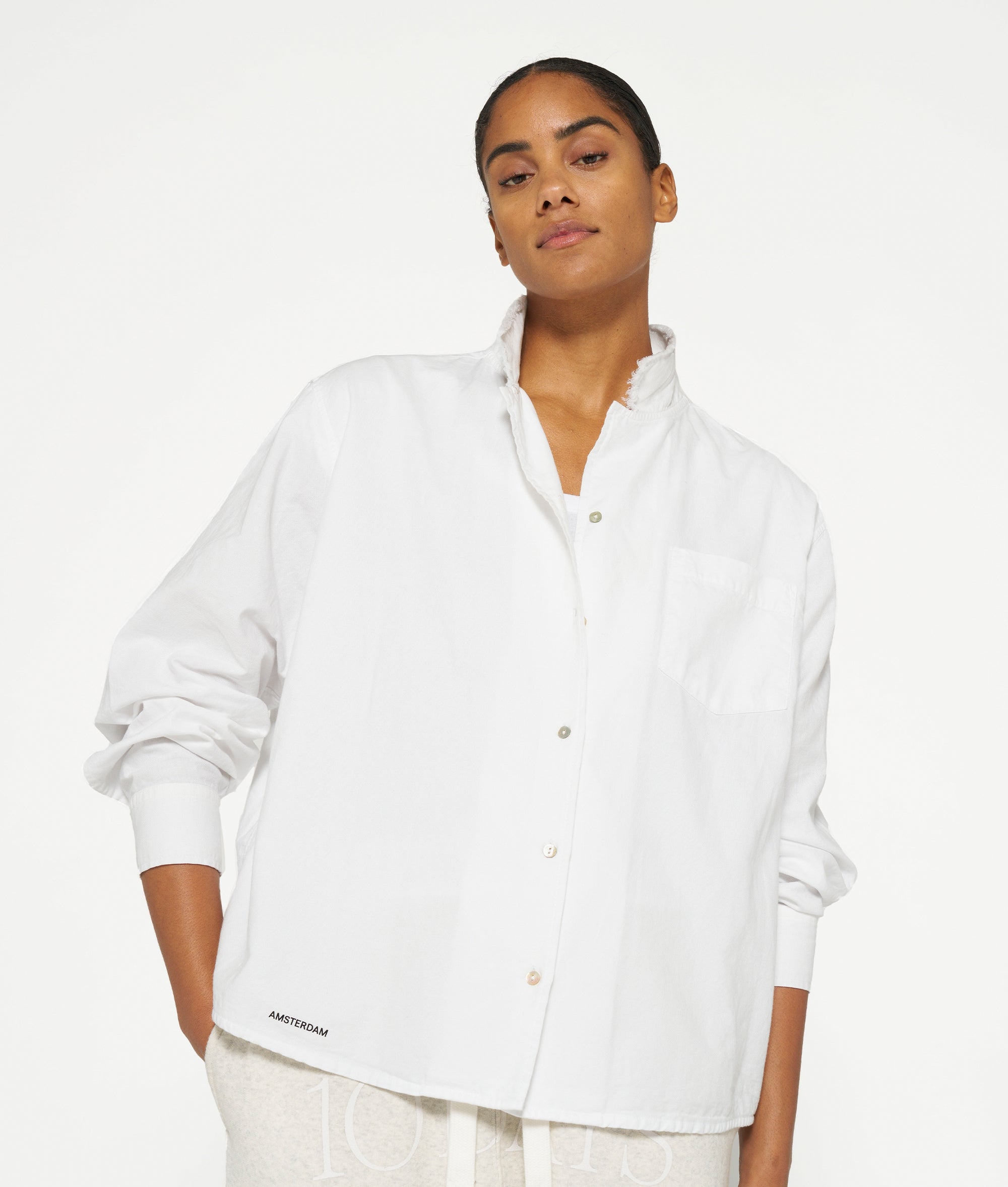 Relaxed fit blouse made of cotton. Features a patch chest pocket, fleece cuffs with raw edge finish, a raw edge collar with button closure, a round hem, a mini stripes embroidery on the back and an ‘unexpectedly simple amsterdam’ print along the seam on the right side.|