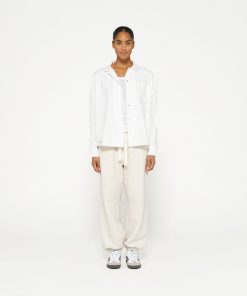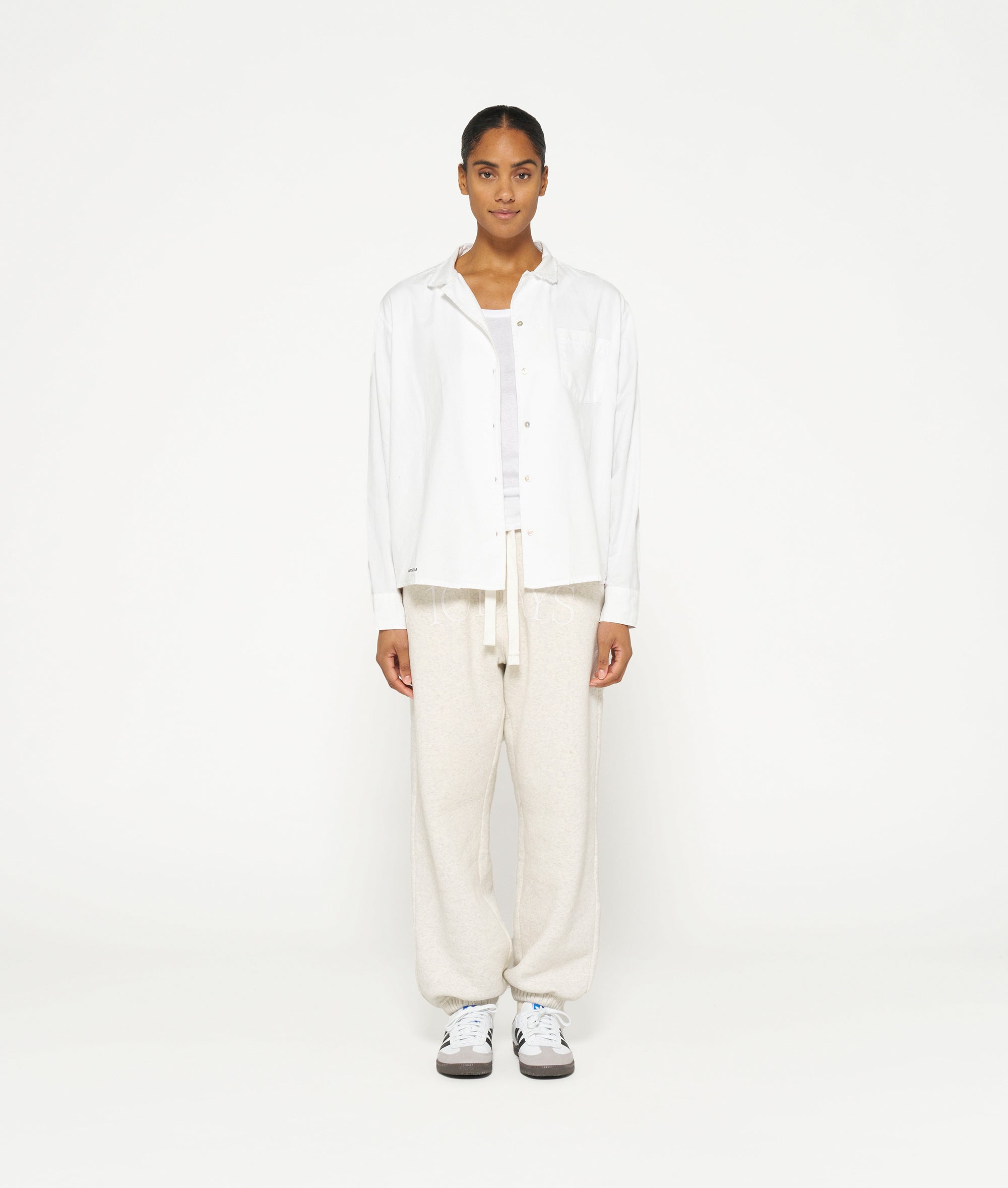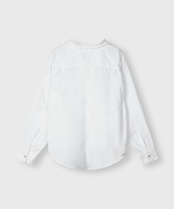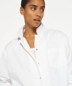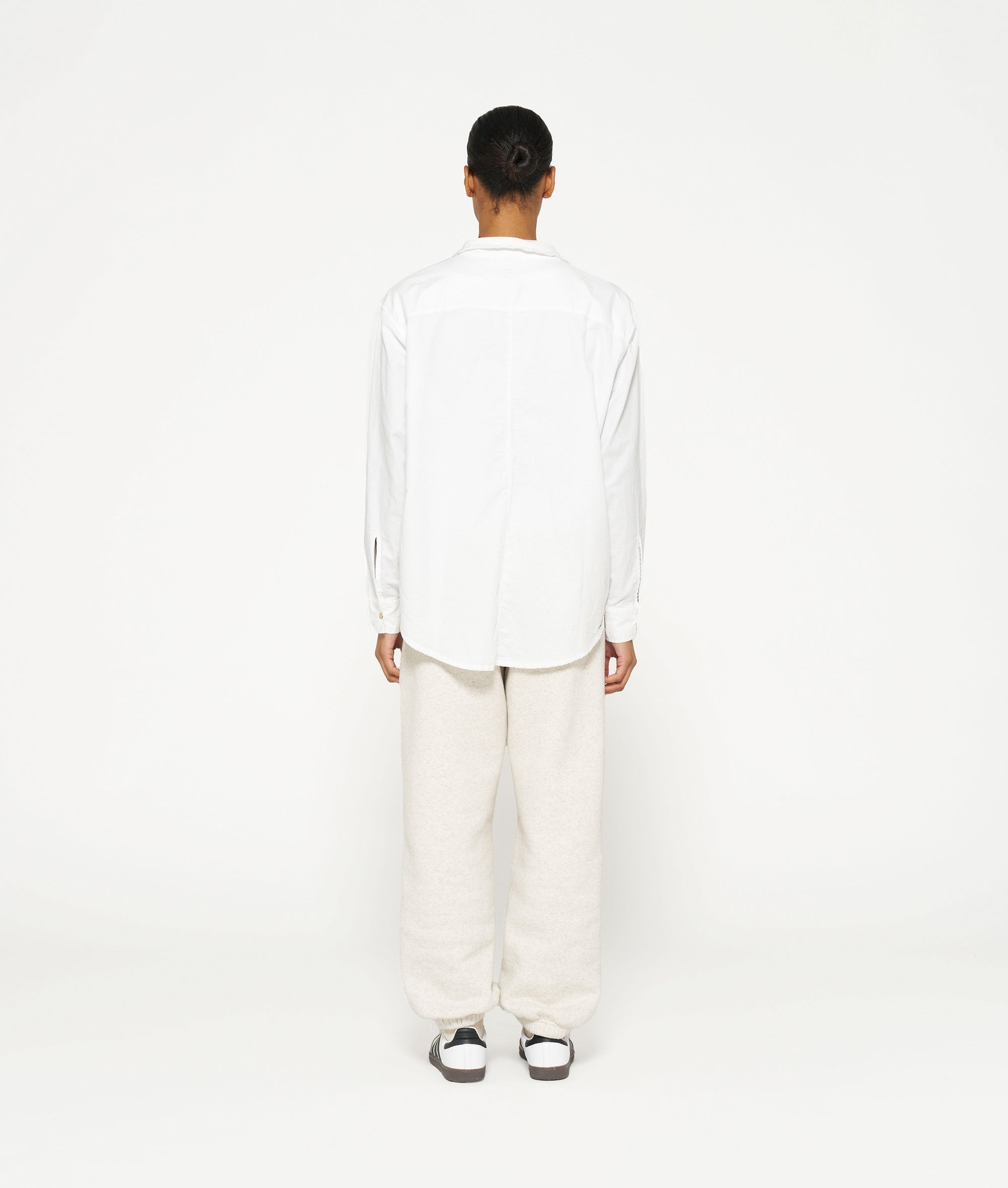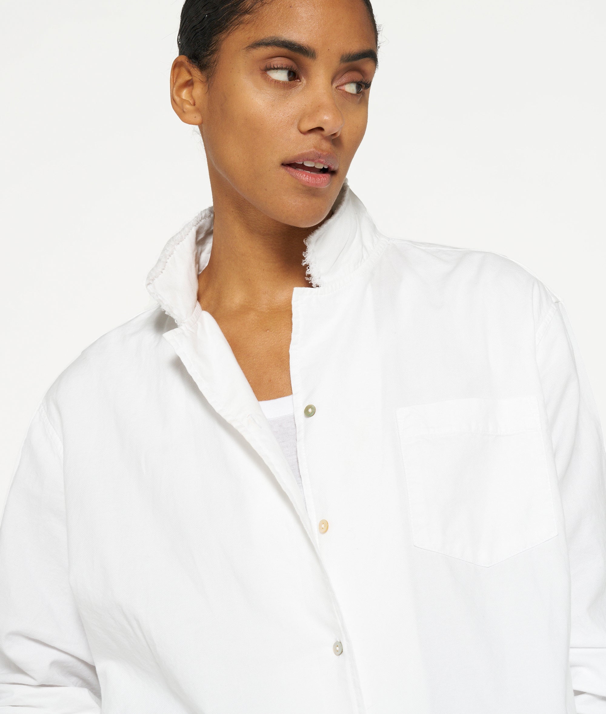Relaxed fit blouse made of cotton. Features a patch chest pocket, fleece cuffs with raw edge finish, a raw edge collar with button closure, a round hem, a mini stripes embroidery on the back and an ‘unexpectedly simple amsterdam’ print along the seam on the right side.|