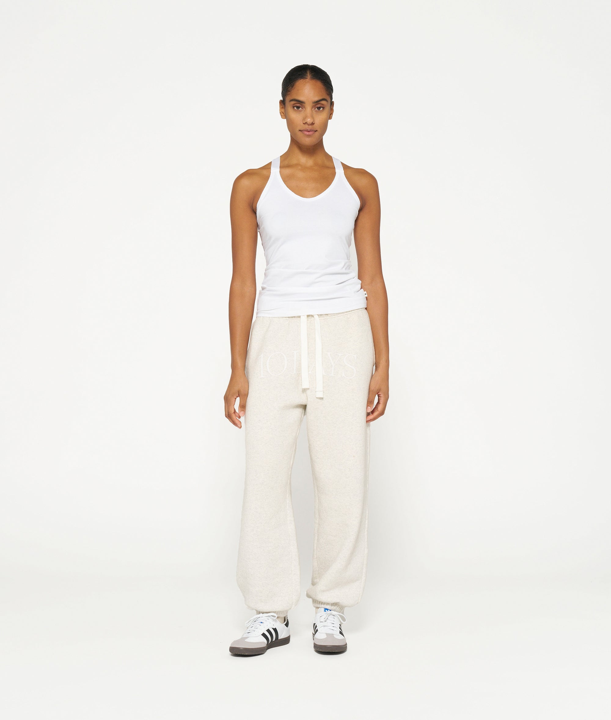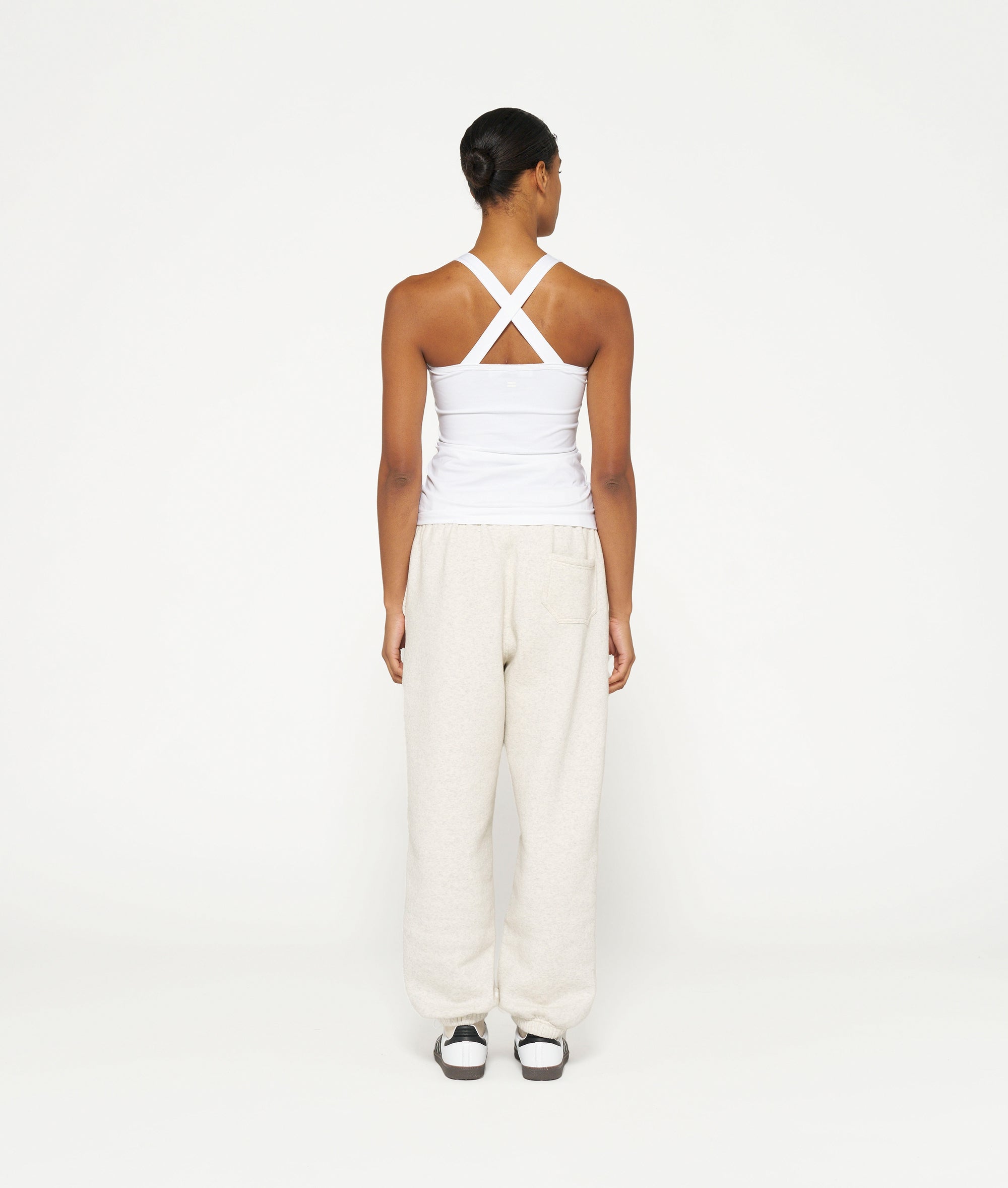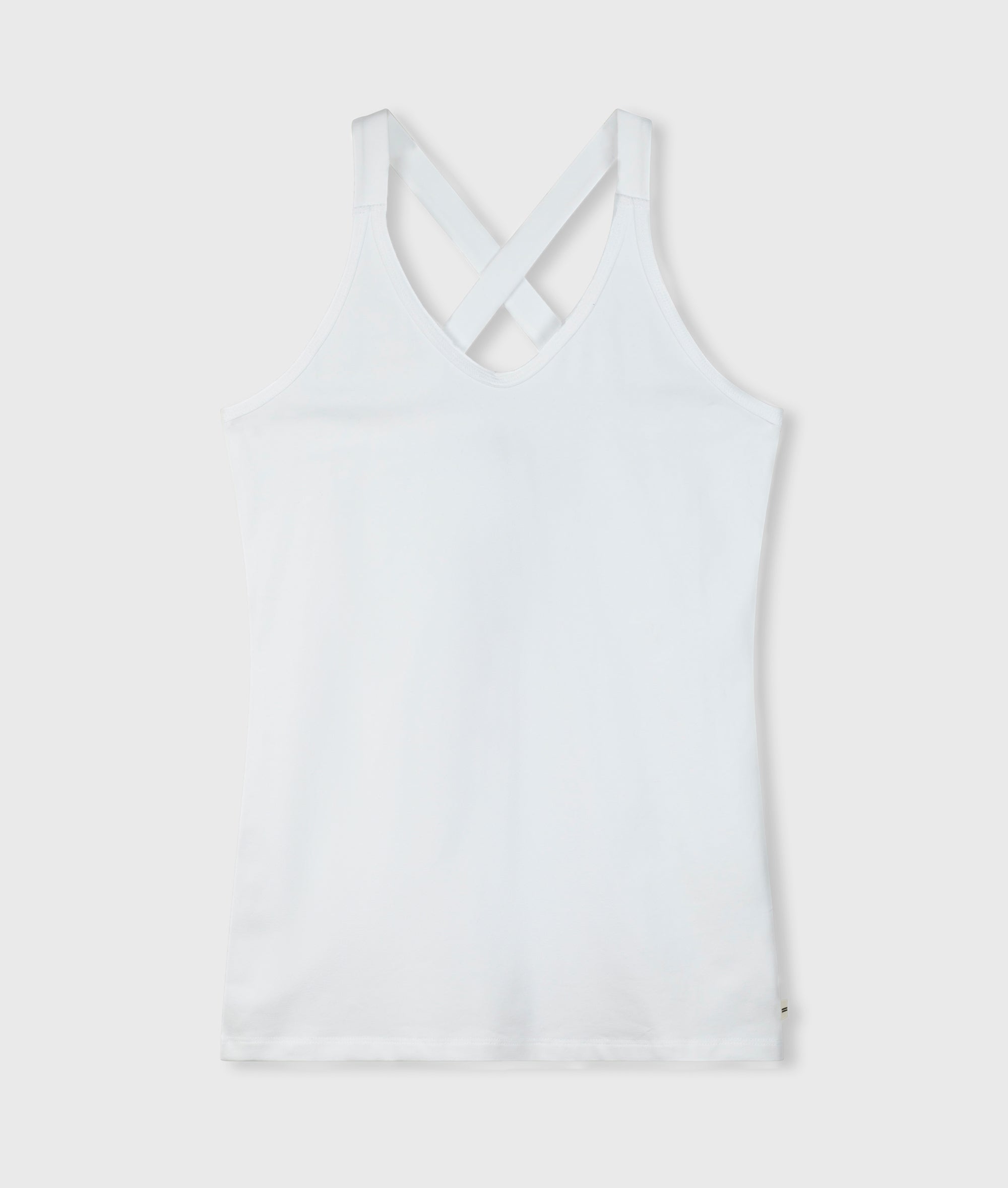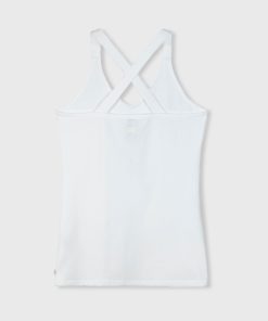 Slim fit singlet top with crossed straps at the back, made from organic cotton blend. Features a vintage finish around the neck and a mini stripes logo on the back.|