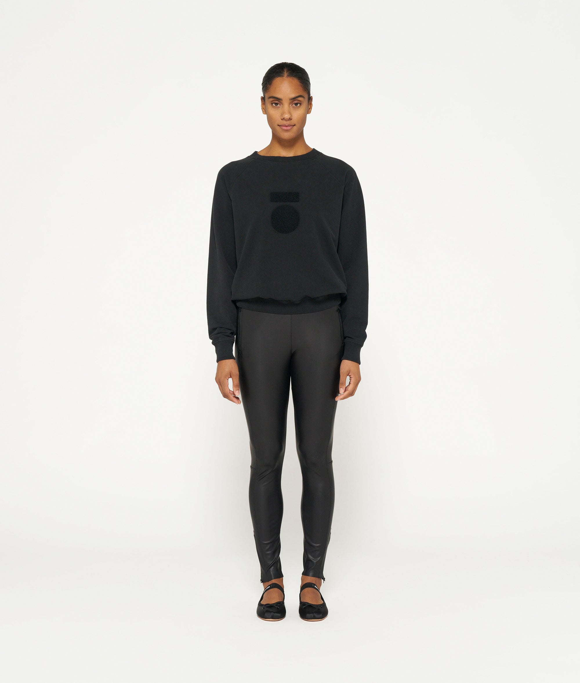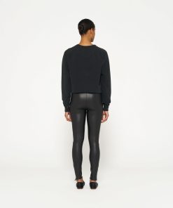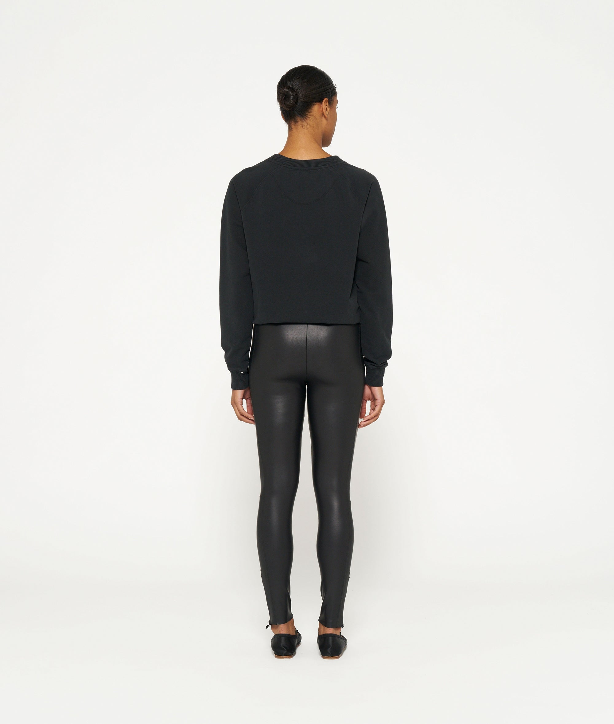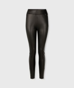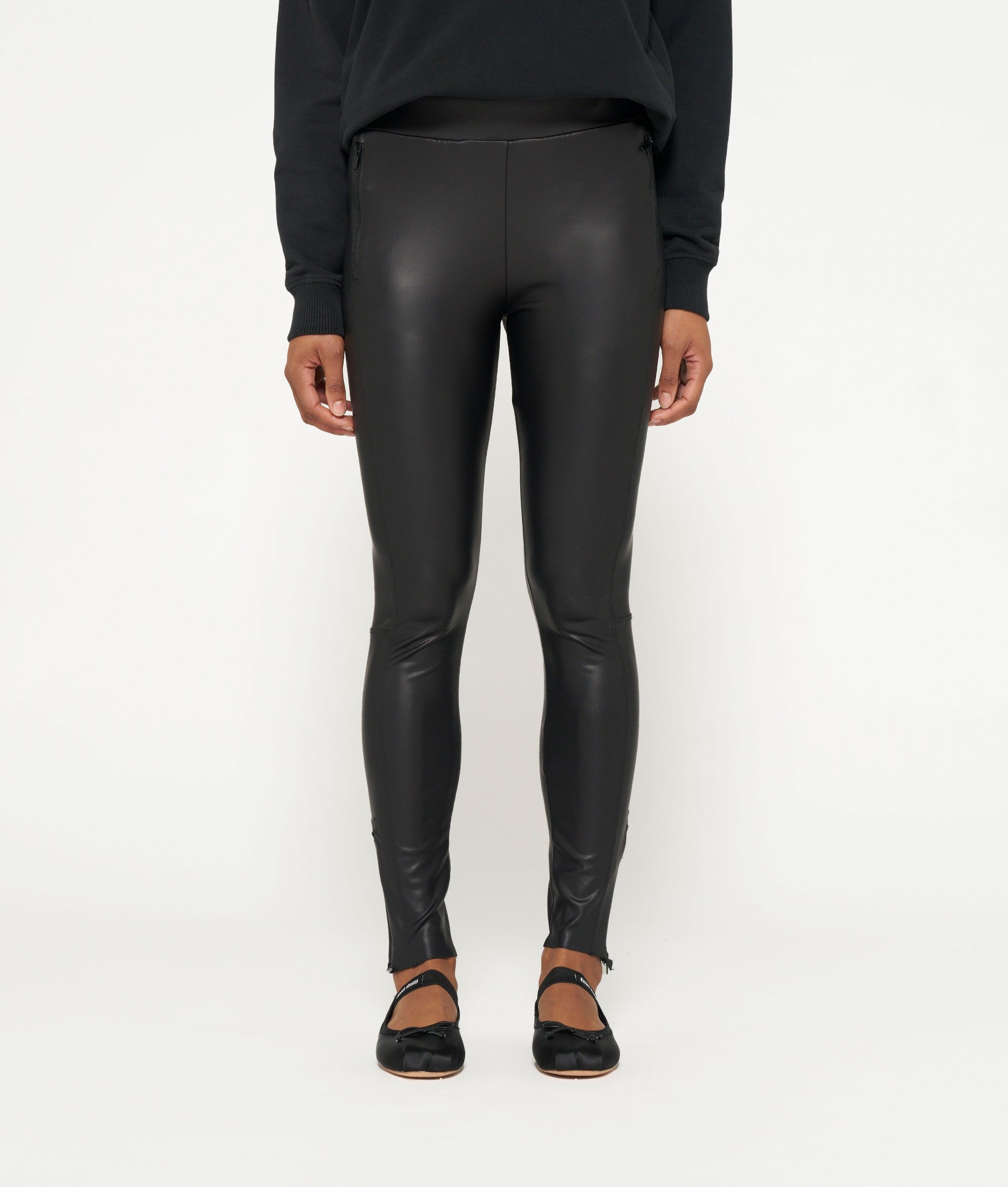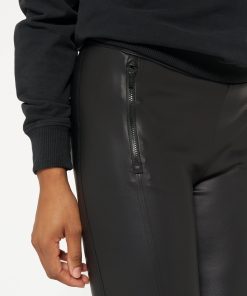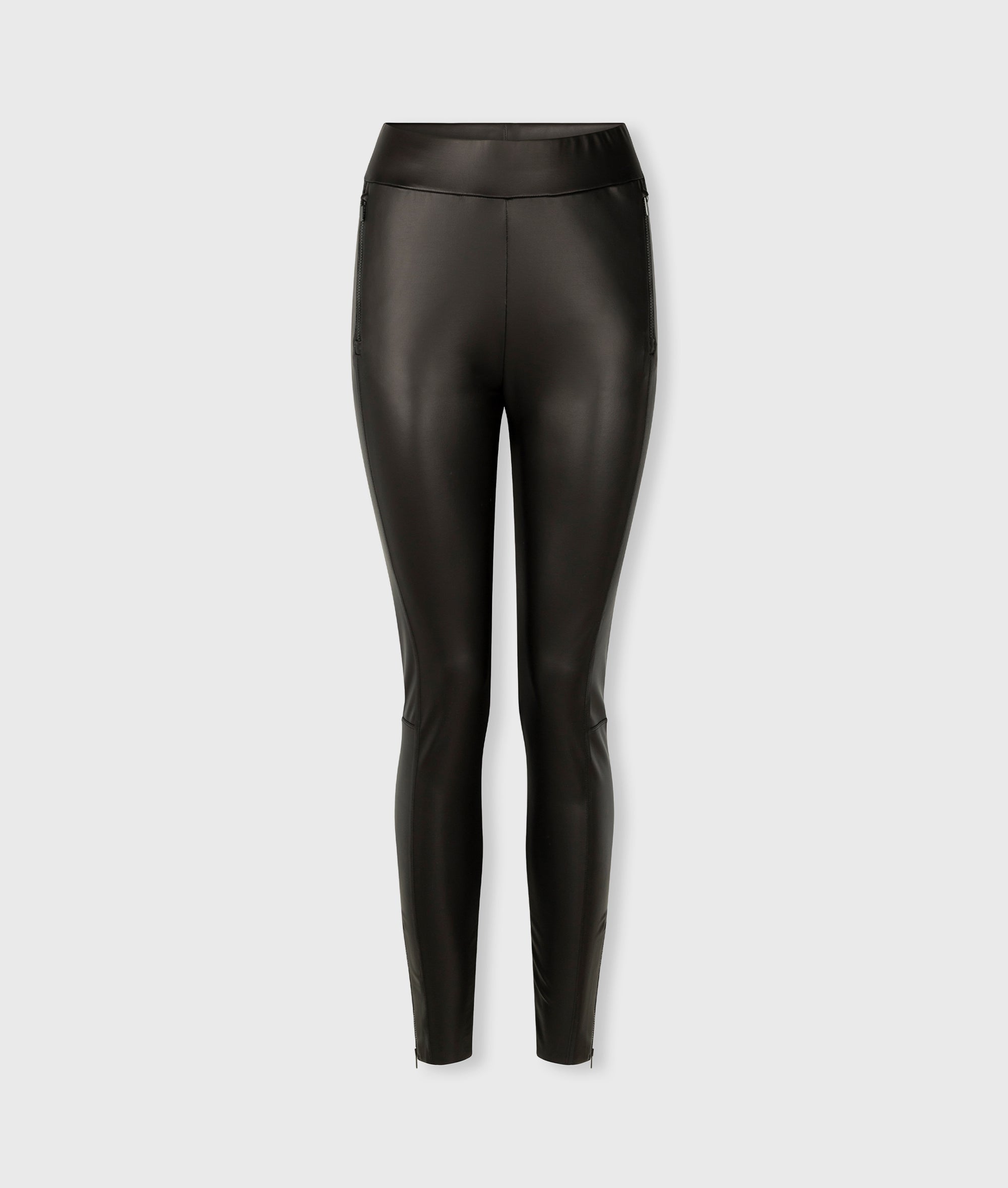 Slim fit leather look leggings with zip details. Features an elastic waistband, zip pockets, raw edge decorative stitching and raw edge legs with zips.|