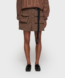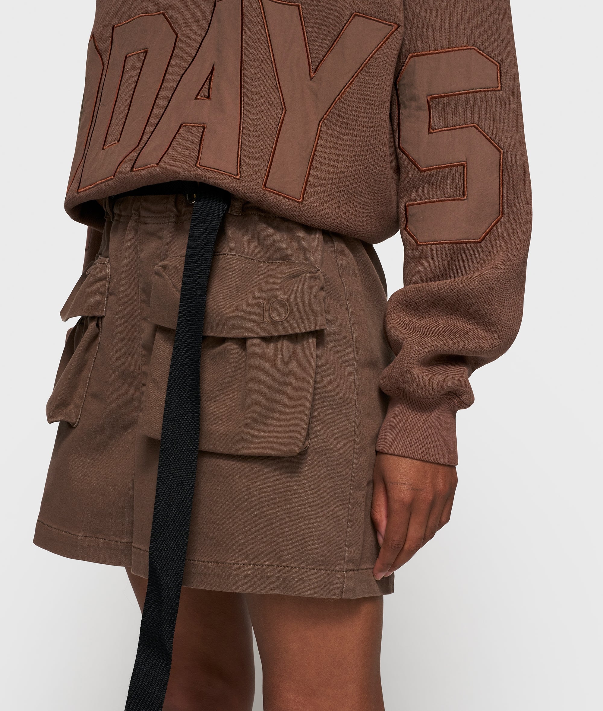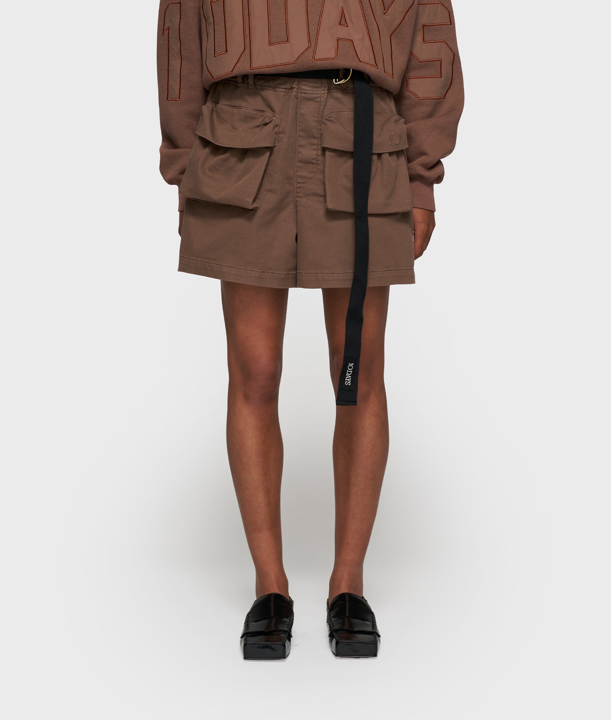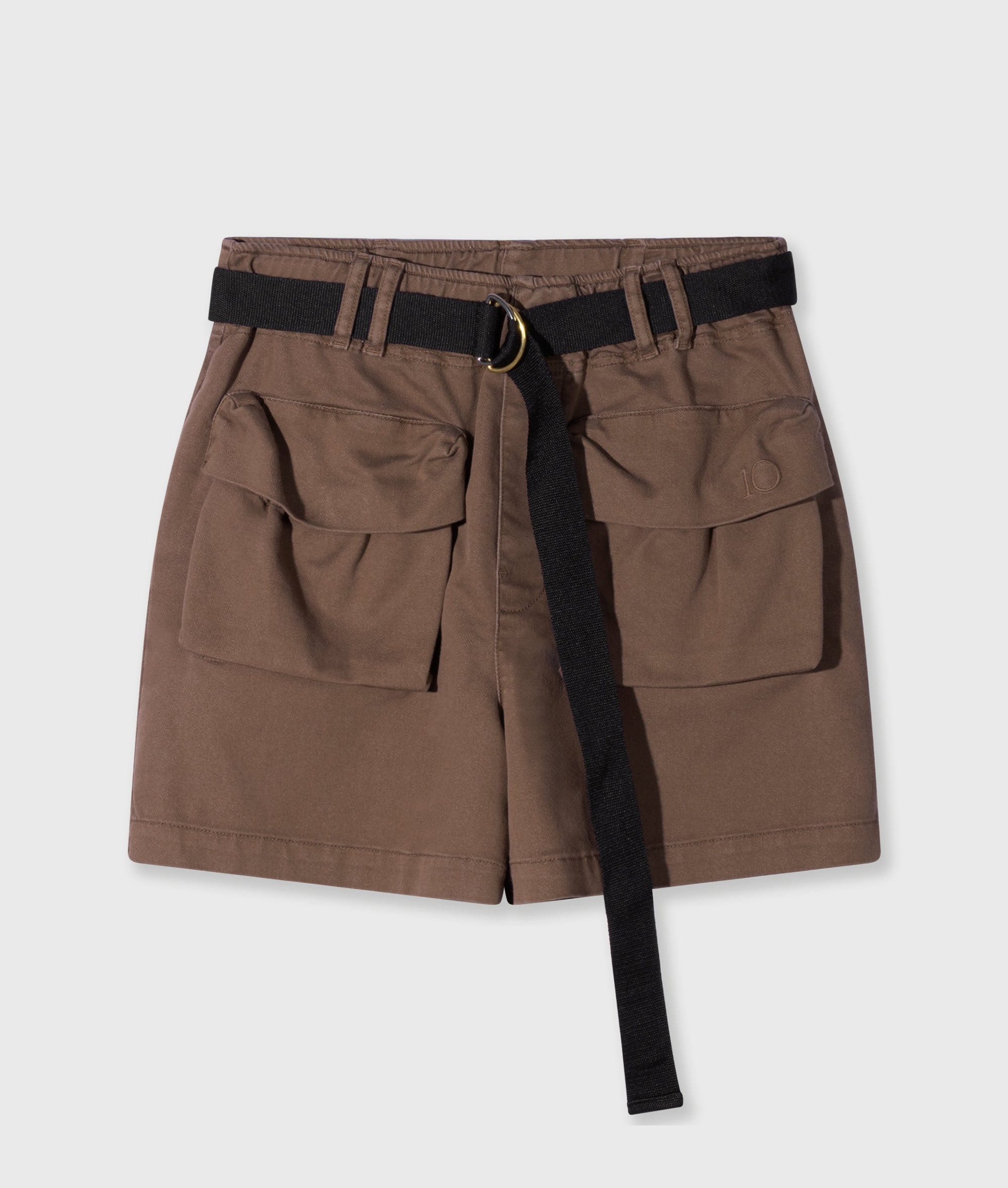 Regular fit utility shorts made from jog twill with a mid-rise elasticated waistband. Designed with belt loops and a detachable belt. Detailed with flap pockets with pleat accents, a monogram embroidery on the left flap.|