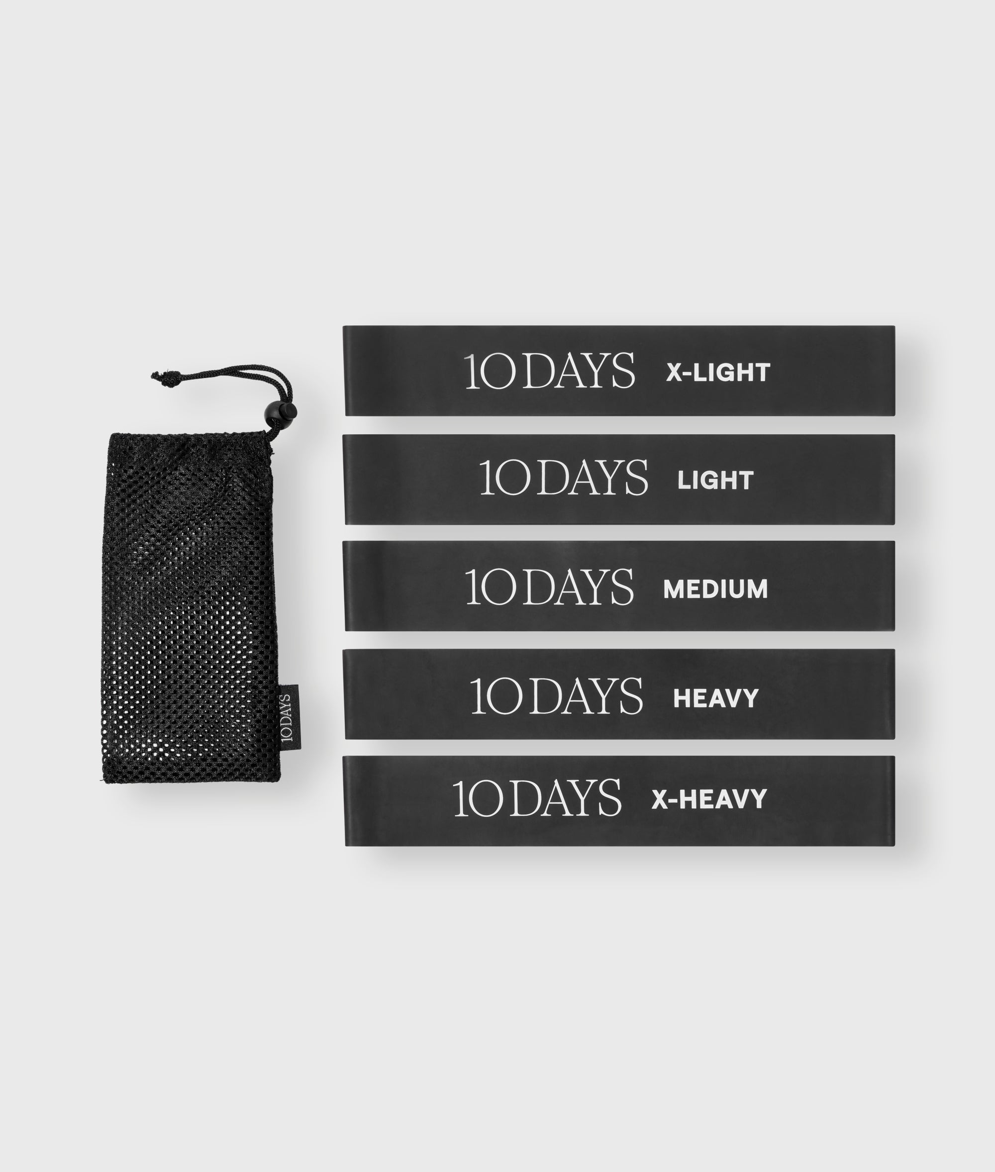 Resistance bands set with 5 different resistance levels: X-Light, Light, Medium, Heavy, and X-Heavy. Easy to carry thanks to the black mesh storage pouch with drawstring. Perfect for warm-ups, strength training, yoga, pilates, and full-body workouts.|